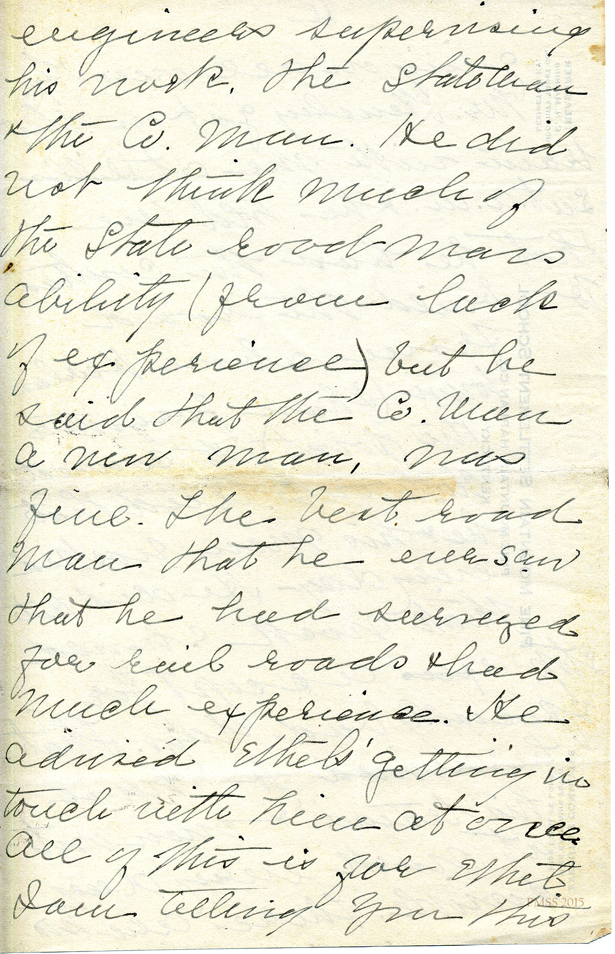 Late Fall 1919. KP, Lexington, KY, en route from Frankfort, to “Ethel” [de Long Zande] [13 half-pages]. Road engineer Mr. Boggs’ advice about convict labor working in winter; leaves the issue for Ethel to negotiate with Boggs and Mr. Holton; provides name of person to whom Ethel should write her complaint about a road worker; Mentions Capt. Winfry, Mr. Watkins, Capt. Williams, Chad Lewis, Sol Day, Mr. Johnson. [038-051]