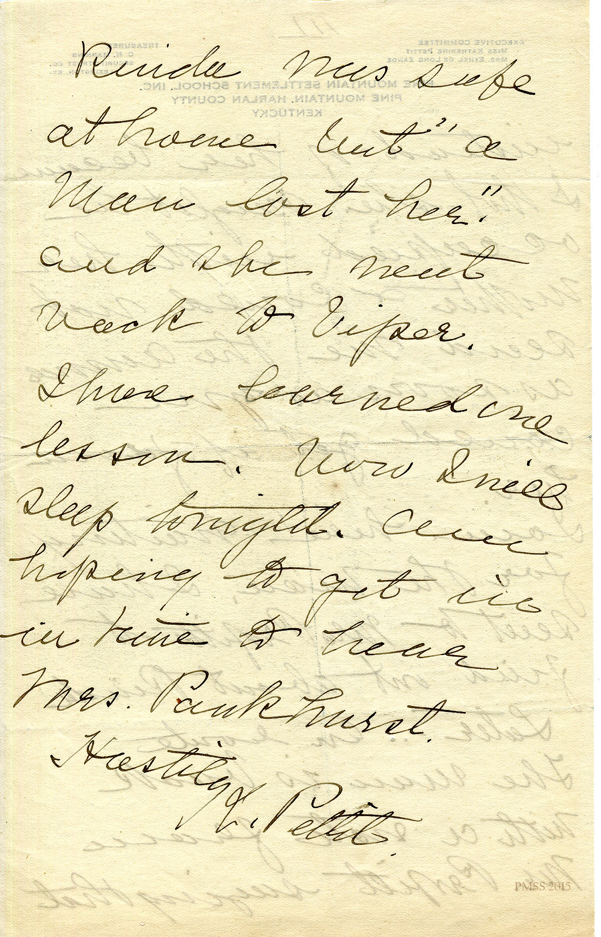 * March 4, 1919. Katherine Pettit to Miss Buffum. Notes that she is glad Buffum will pay a visit to Pine Mountain and to let PMSS know dates. Also notes, “Aside from coing to us for May and June (at least), can you come up in April for the wild-flower expedition [origin of Black Mountain Wild Flower Weekend] on Black Mountain? Miss Wells and I want to go to Benham the last of the month, over some week-end, climb to the top of Black and walk along the mountain to Partridge, the highest point in Kentucky, stay there at the foot of the mountain over night, and the next day walk along the Poor Fork back to the train. | I think we may be able to arrange a date to suit you, if you can tell me right away just when you could best come. It will take you three days from Harrogate, but of course we hope you will come back to the Pine Mountain for a night at least with us, as you did last time. | Mr. Deschamps is coming either this week or next week. He is probably in Louisville now with the Zandes. I hope you will be here to control Mr. Deschamps’ perfect acre work! |I wonder if you are going to Knoxville. Miss Stone, Miss Butler and Miss Robbins are planning to go from here, and Miss Robbins wants to see Lincoln Memorial University …