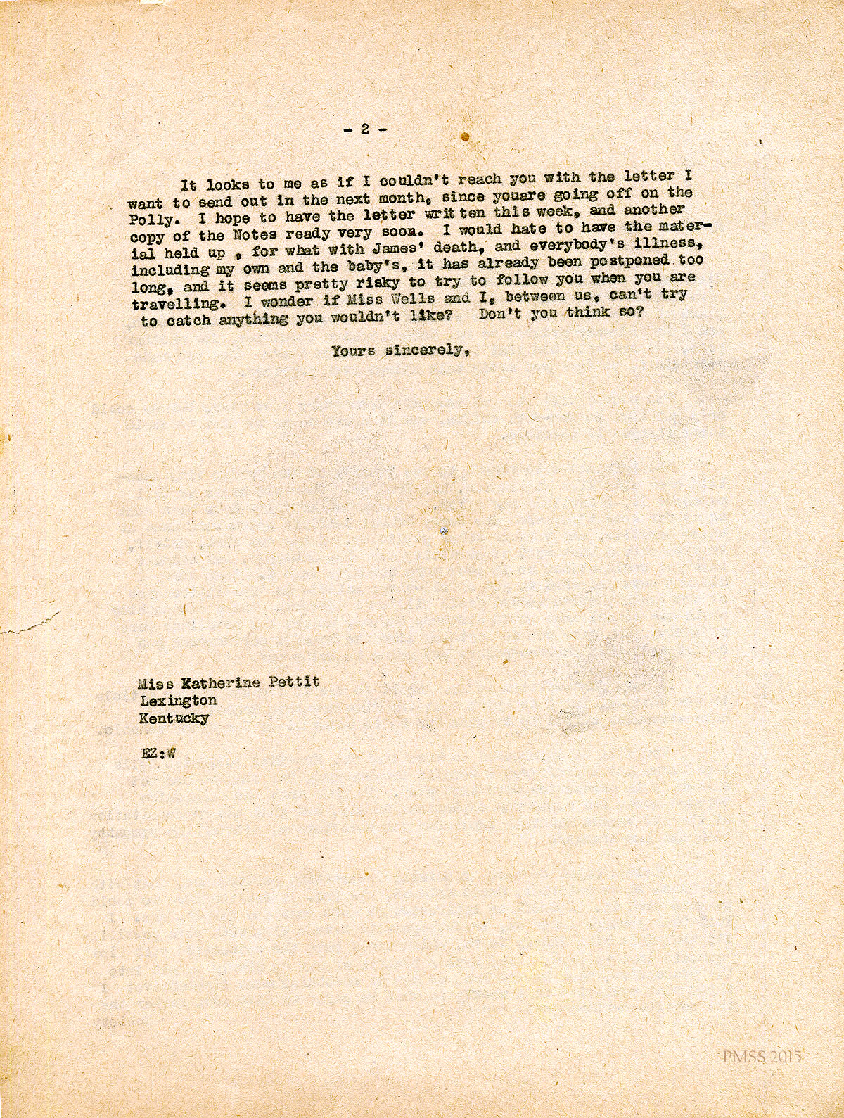 February 16, 1925. [unsigned] EZ to “Kate” (Katherine Pettit), Lexington, KY. [PMSS letterhead]. Purchase Mr. Wilson’s land? [Miss Pettit’s handwritten reply begins on same page: KP would like to buy it and asks for details.] [003-004]