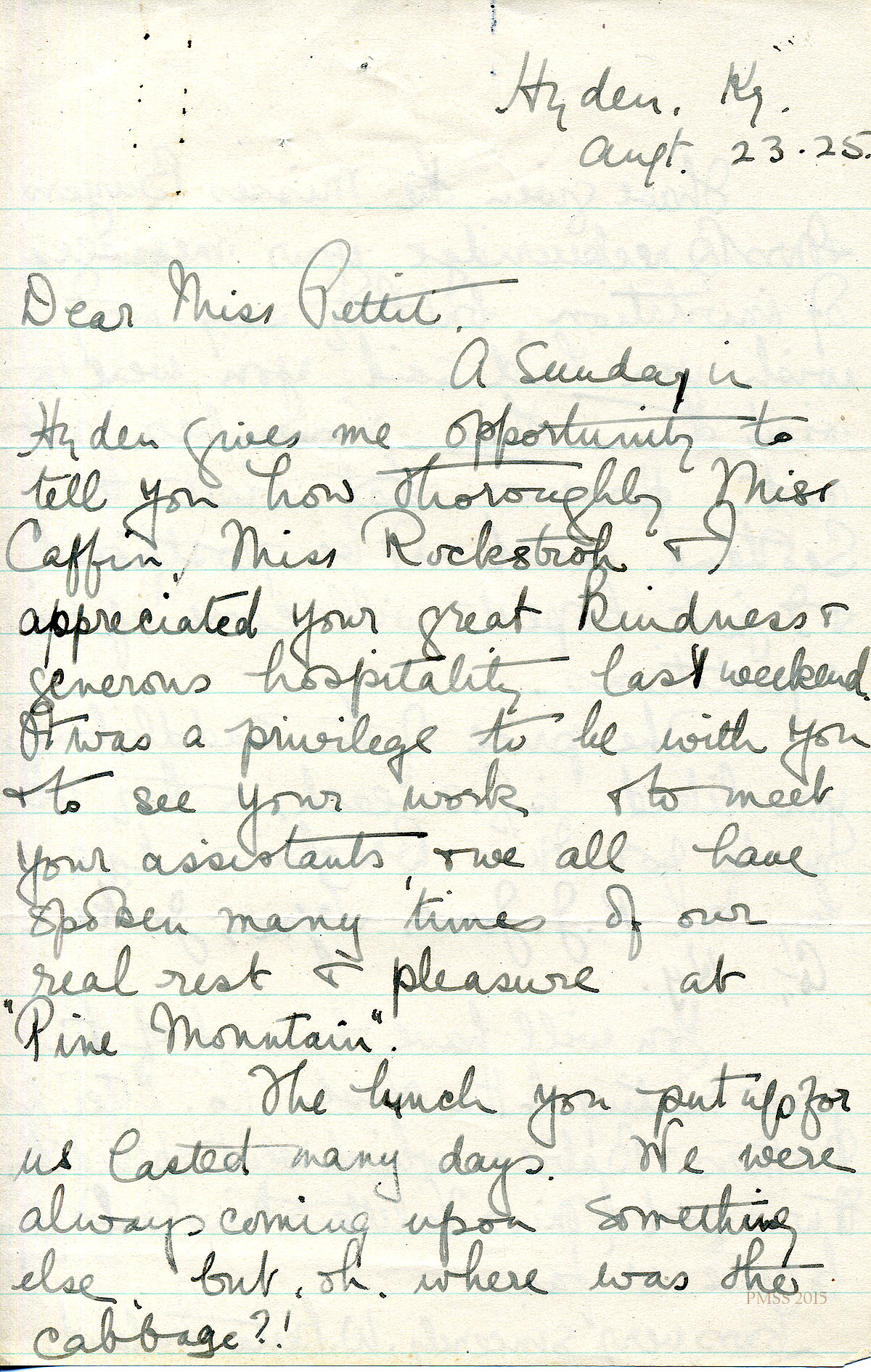 August 23-25, [no yr]. W. Berta Ireland, Hyden, KY, to Miss Pettit. Handwritten thanks for hosting Miss Caffin, Miss Rockstroh, and herself at P.M. [013-014]