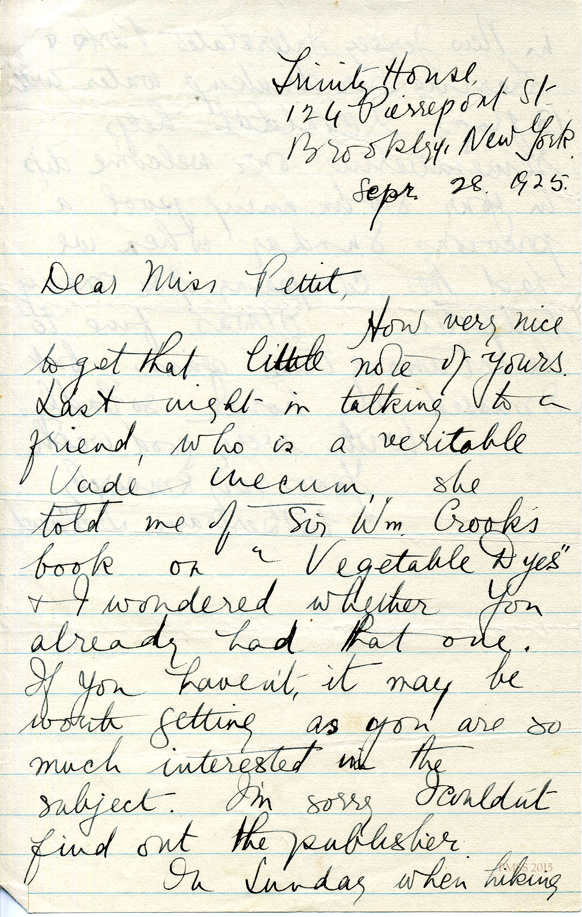 September 28, 1925. W. Bertrain Ireland, Trinity House, Brooklyn, NY, to Miss Pettit. [Handwritten]. Suggests book “Vegetable Dyes” by Sir Wm Crook. [015-016]