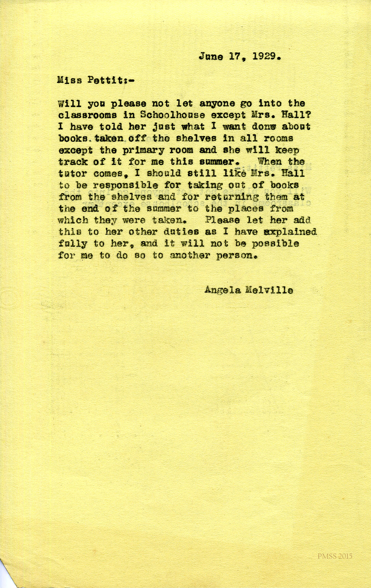 June 17, 1929. Angela Melville to Miss Pettit. Mrs. Hall is the only one allowed in Schoolhouse classrooms to tend to books for the summer. [012]