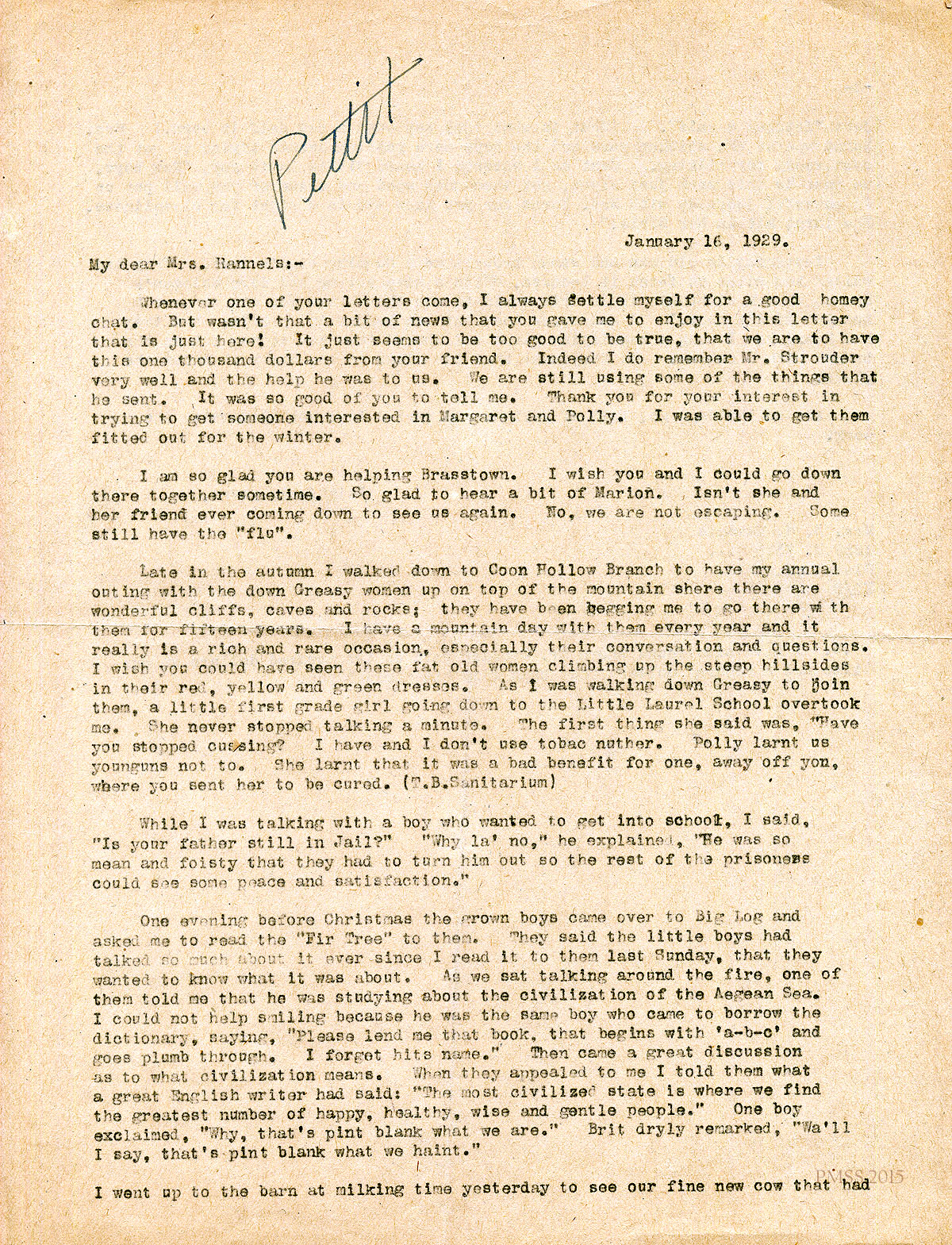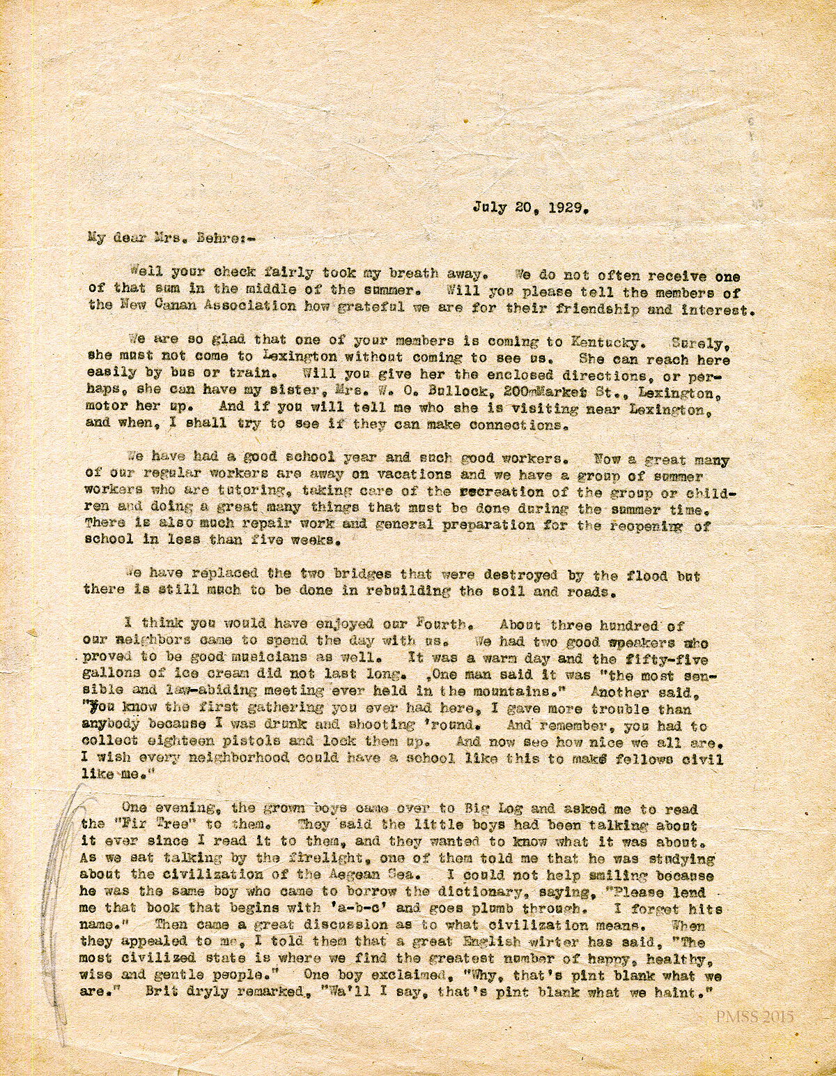 TAGS: Katherine Pettit Correspondence 1929 ; Katherine Pettit ; Ethel de Long (Zande) ; Pine Mountain Settlement School ; Pine Mountain, KY ; Constance Wheeldon ; student anecdotes ; Mrs. Neil McCovel ; Mrs. B.U. Rannels ; Mr. Strouder ; Mary Rockwell (Mrs. Inghram D.) Hook ; Uncle Solomon story ; Edith Canterbury ; PMSS Christmas ; Nan Cobb ; Boy’s House ; housemothers ; hiring ; Mrs. Keezel ; Angela Melville ; KY Utilities Co. ; Mrs. Hall ; School House ; Ursula Tyler ; Mabel C. Gage ; floods ; summer workers ; Jessie Hardwick ; July 4th event ; Uncle Bill Stacy’s funeral ; Mrs. John H. Behre ; New Canaan (CT) Assn ; Mrs. Carl B. Bare ; Sewing Society ; Glyn Morris ;