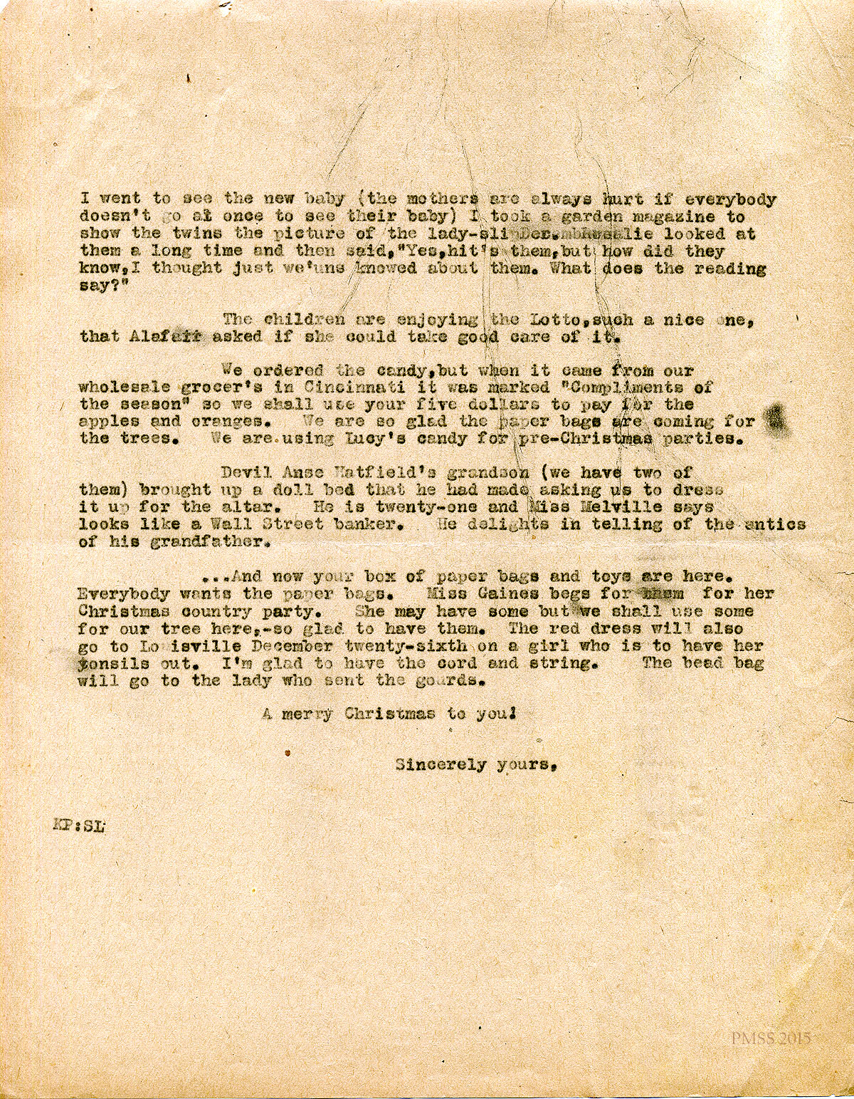 December 17, 1929. [unsigned] KP to Sewing Society. Thanks for Christmas parcels; children bringing items for wreaths; distributing gifts. [023-024]