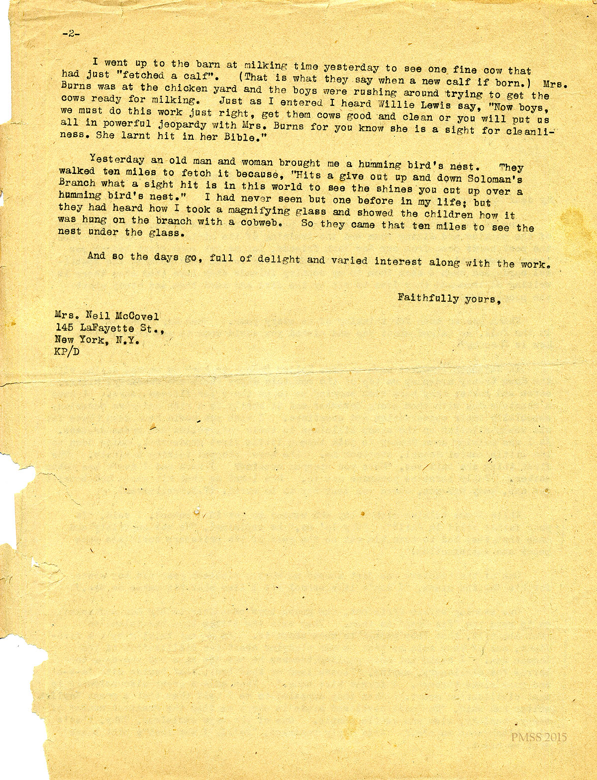 July 10, 1929. [unsigned] KP to Miss Ursula Tyler, Grove City, OH. Community gathering; anecdotes about the PMSS community and students. [013-014]