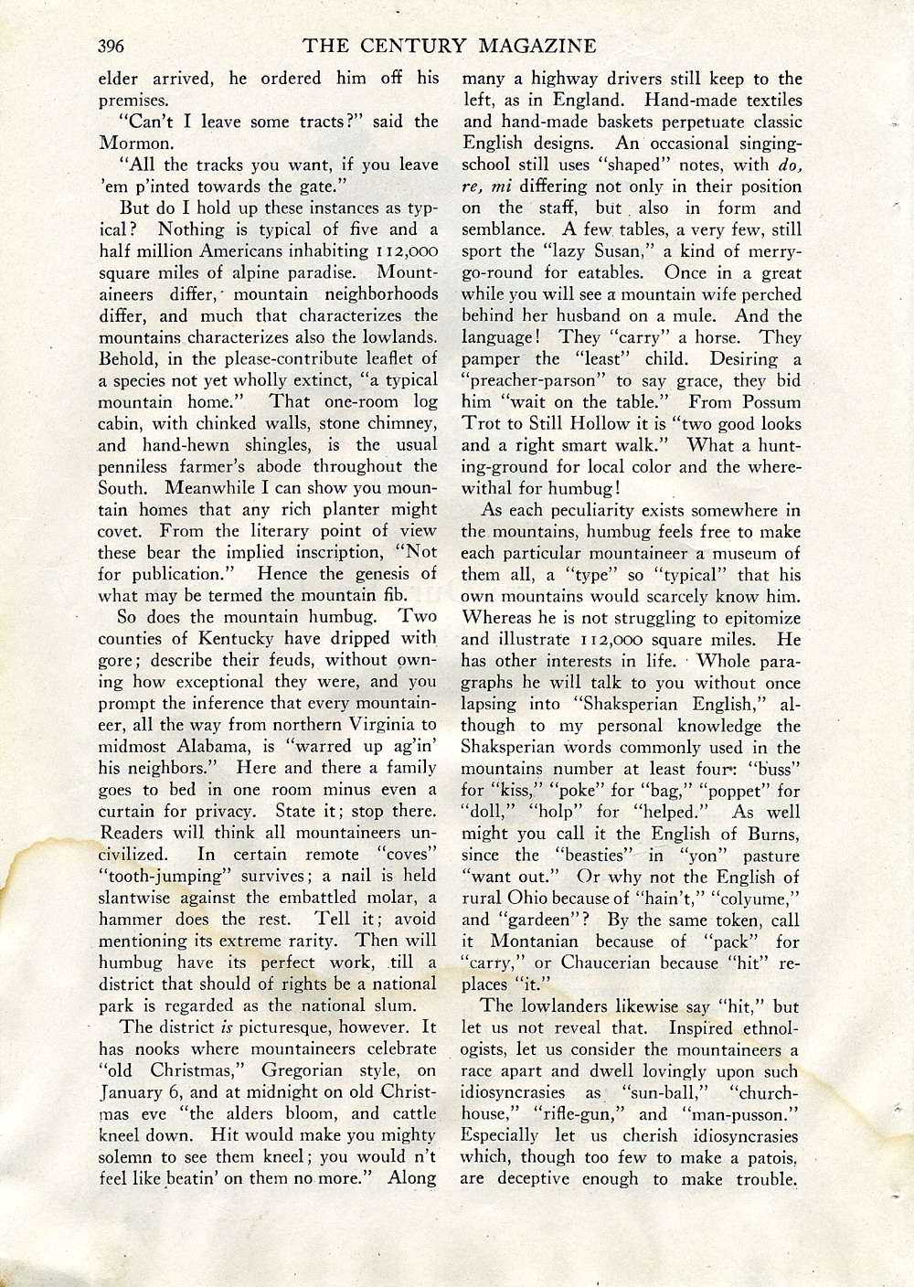 As each peculiarity exists somewhere in the mountains, humbug feels free to make each particular mountaineer a museum of them all, a “type” so “typical” that his own mountains would scarcely know him. Whereas he is not struggling to epitomize and illustrate 112,000 square miles. He has other interests in life. Whole paragraphs he will talk to you without once lapsing into “Shaksperian English,” although to my personal knowledge the Shaksperian words commonly used in the mountains number at least four: “buss” for “kiss,” “poke” for “bag,” “poppet” for “doll,” “holp” for “helped.” As well might you call it the English of Burns, since the “beasties” in “yon” pasture “want out.” Or why not the English of rural Ohio because of “hain’t,” “colyume,” and “gardeen”? By the same token, call it Montanian because of “pack” for “carry,” or Chaucerian because “hit” replaces “it.”