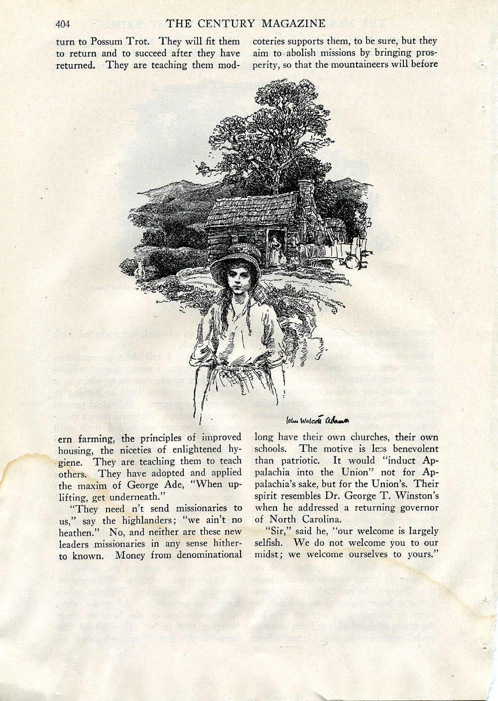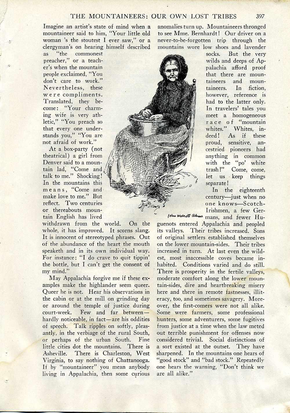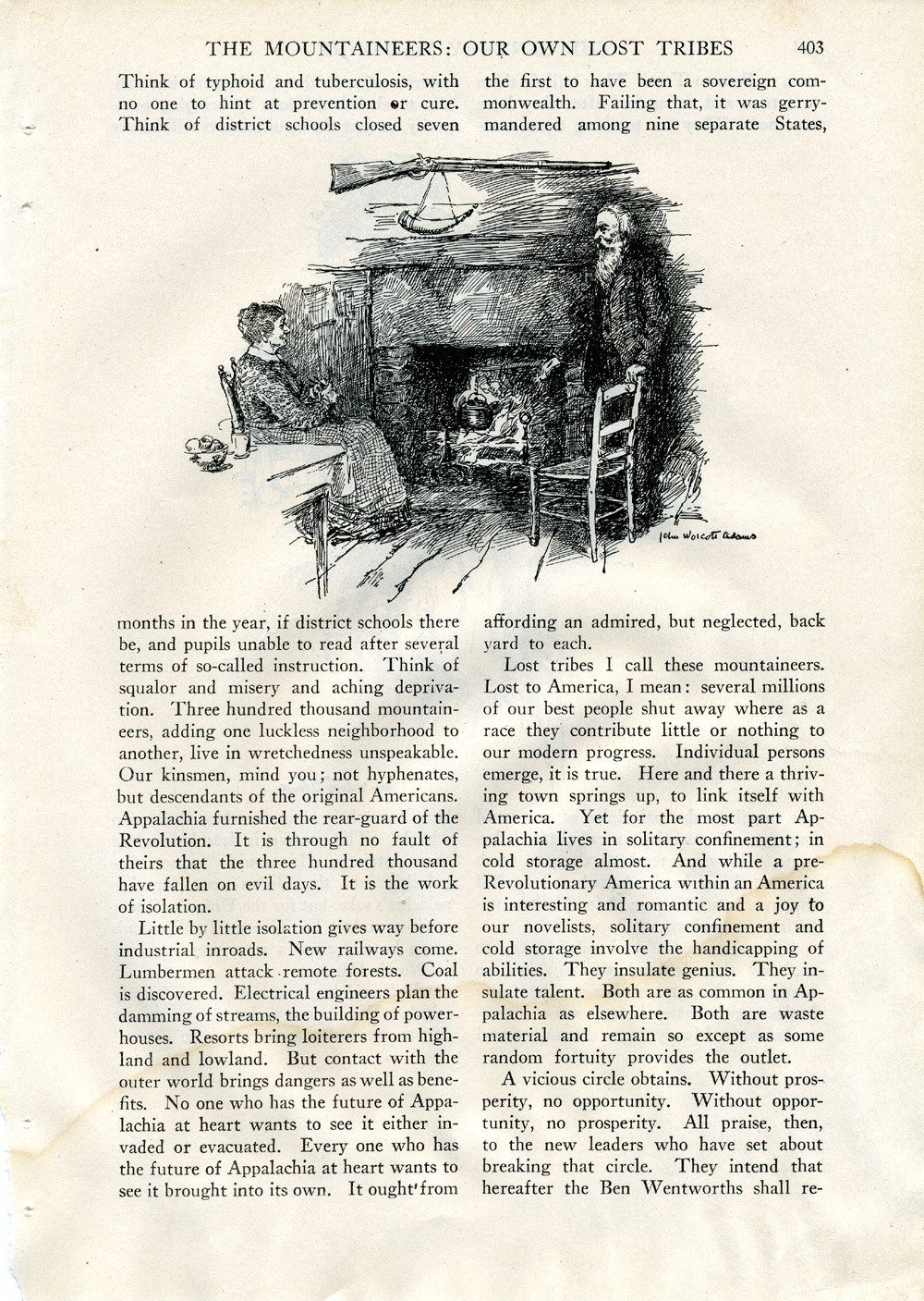 This article, “The Mountaineers: Our Own Lost Tribes,” describes the variety of life in the Central Appalachians during the first quarter of the twentieth century. Written by Rollin Lynde Hartt and illustrated by John Wolcott Adams, it was published as a vignette in the January 1918 issue of The Century Magazine, (New York City: volume 95, no. 3, pages 395 – 403), and also printed in 1918 as a book with the same title by Century Company of New York City.