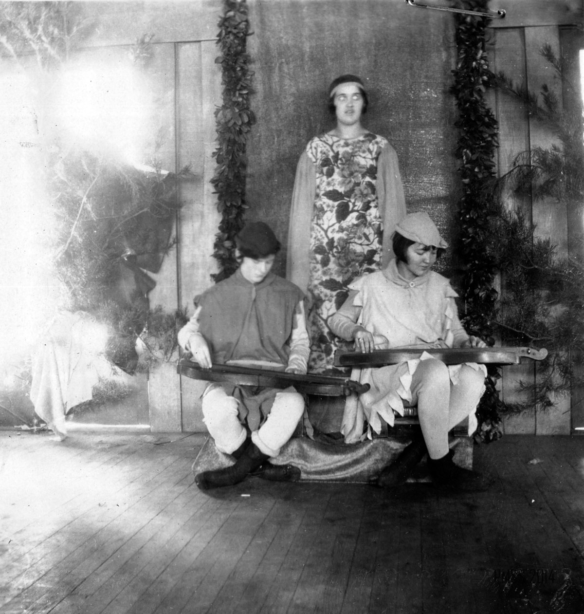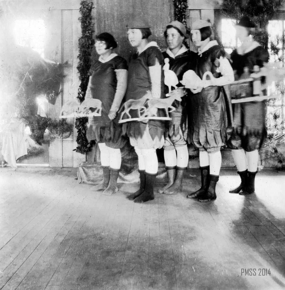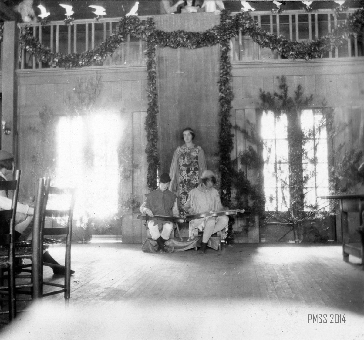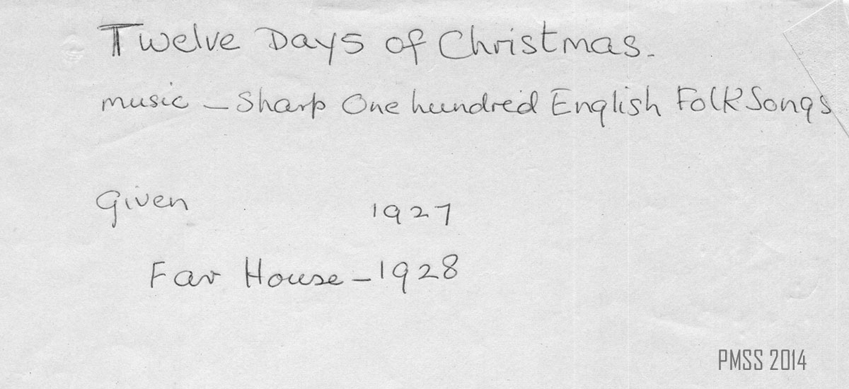 Inspired by Cecil J. Sharp who visited the School in the summer of 1917, this presentation of the Twelve Days of Christmas, is probably based on the published 1916 version of the song and music found in Sheet Music from Cecil J. Sharp, ed., One Hundred English Folksongs (Oliver Ditson Company, Boston, 1916), #96, pp, 224-225. According to the notes of Mary Rogers, the first performance was in 1927 and the second in 1928 at Far House I.