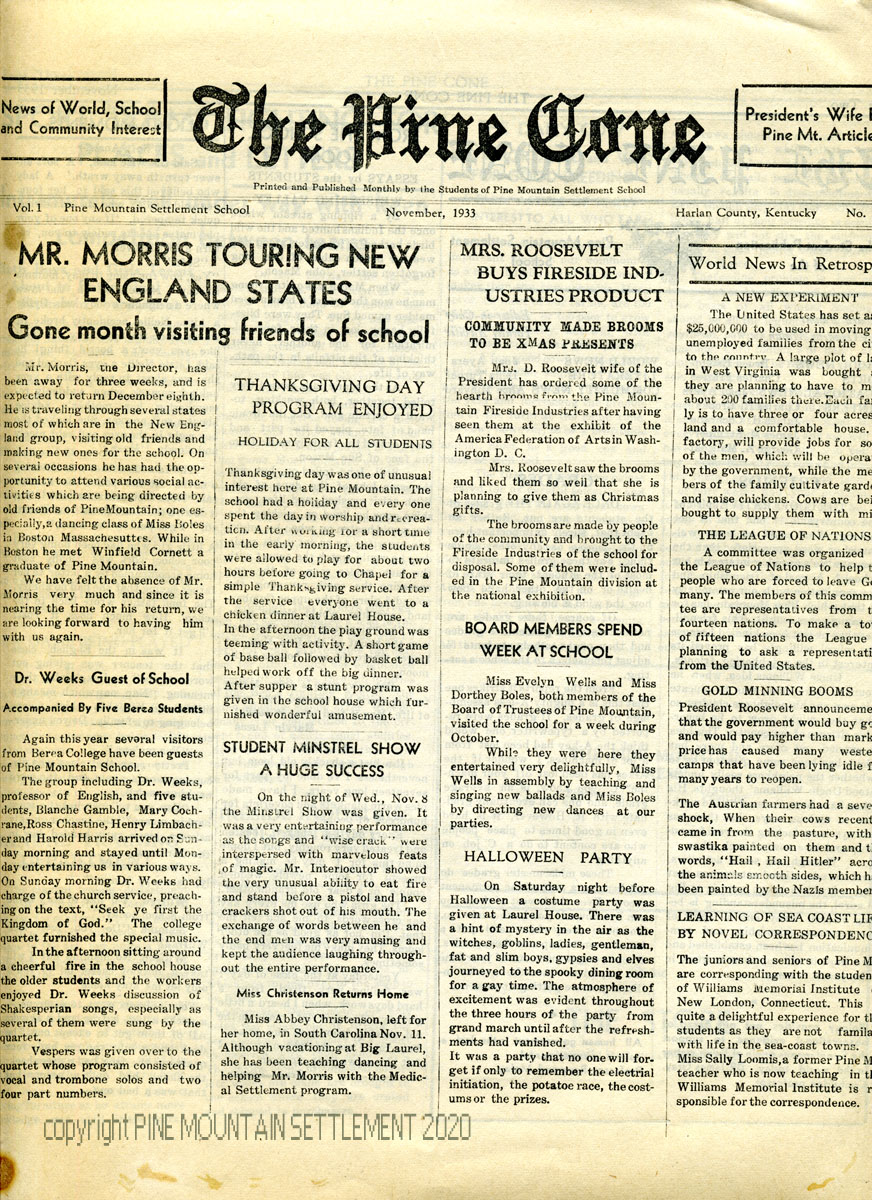 TAGS: Pine Cone 1933 November, student writings, student activities, campus news, world news, visitors, Thanksgiving activities, Mrs. Roosevelt, Fireside Industries, Halloween Party, farm, alumni