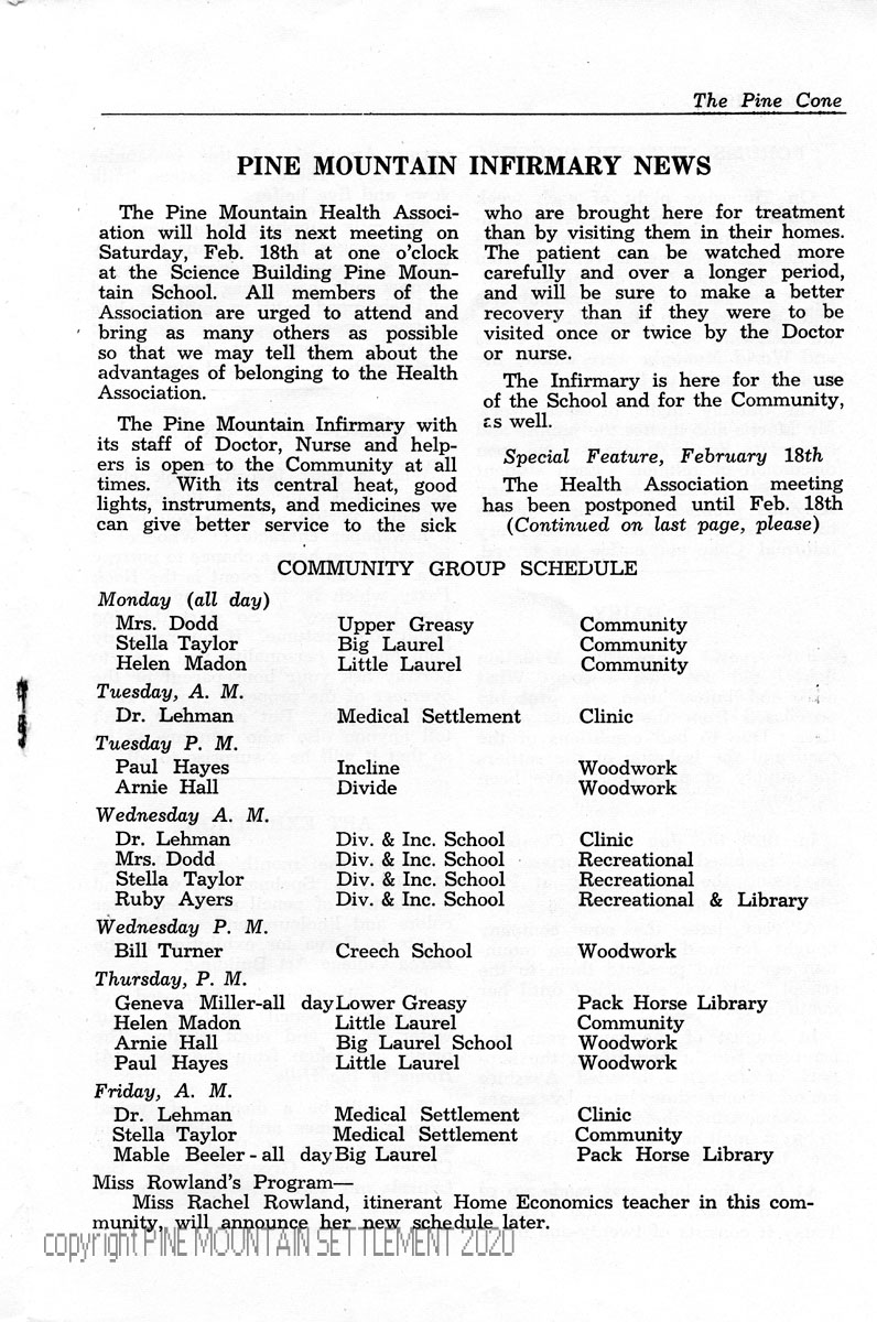 Meeting of the Pine Mountain Health Assn is planned to talk about advantages of belonging to the Health Assn; Pine Mountain Infirmary is open to school and community at all times.