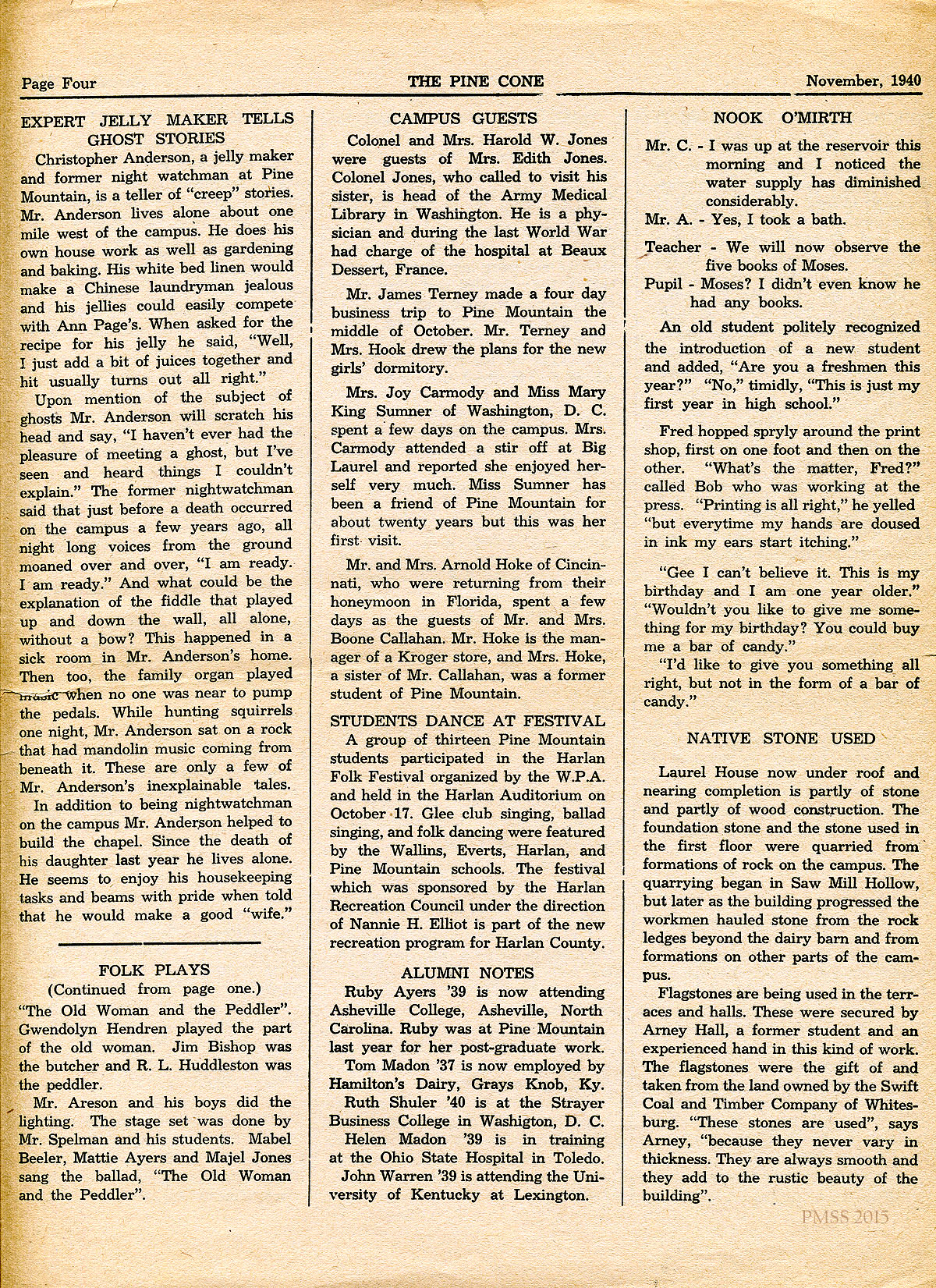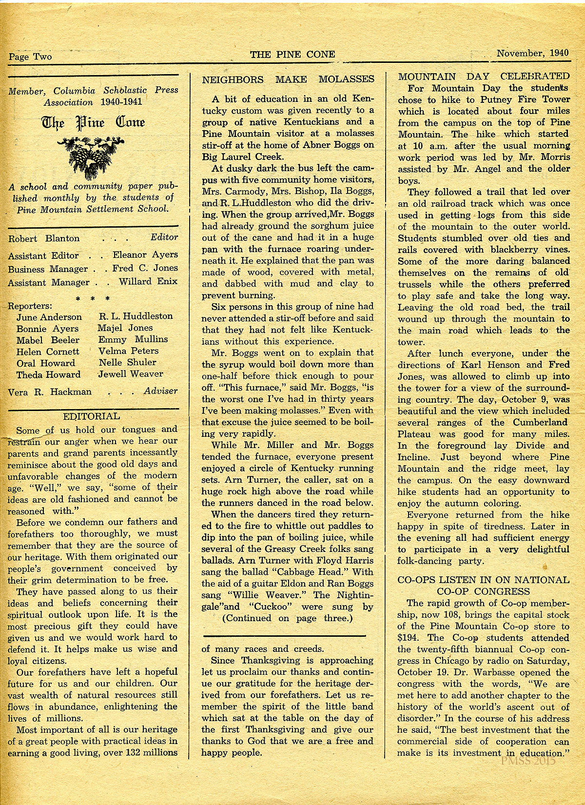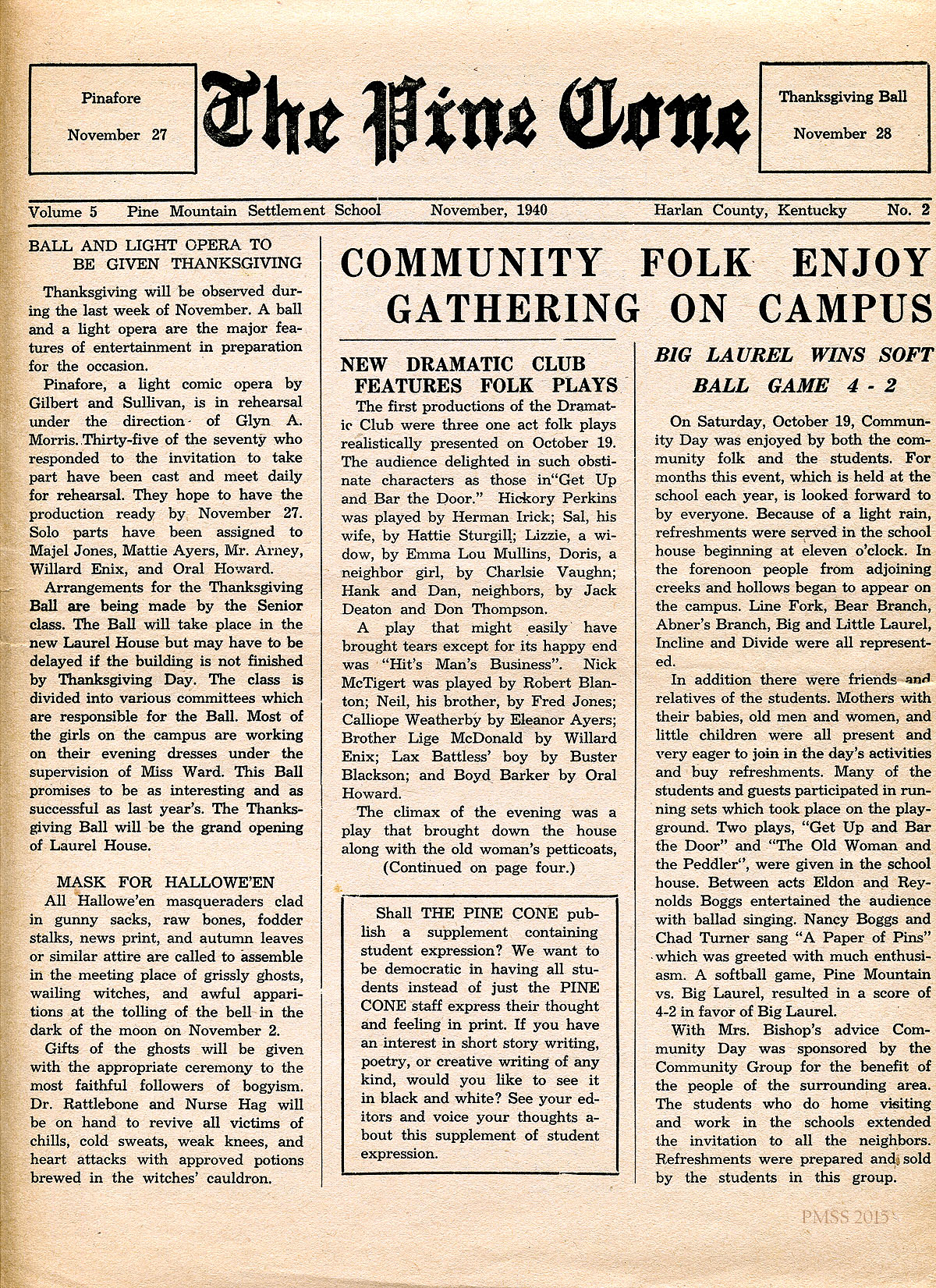 “A school and community paper published monthly by the students of Pine Mountain Settlement School.”