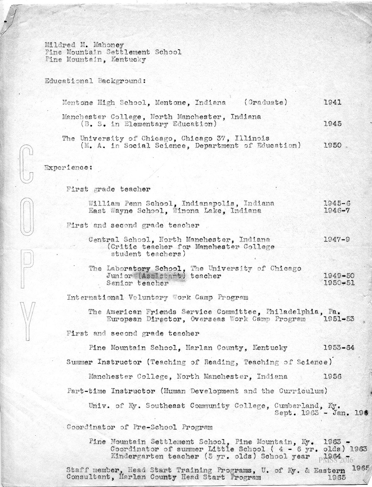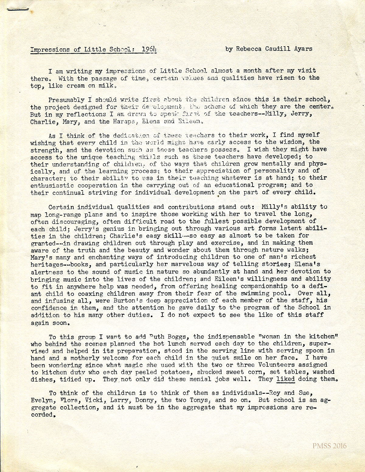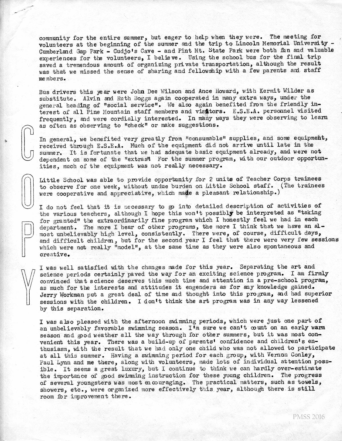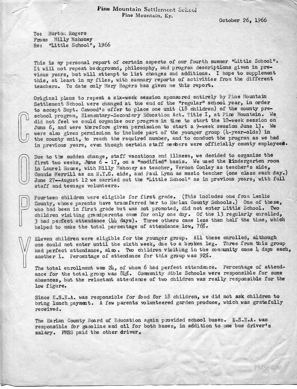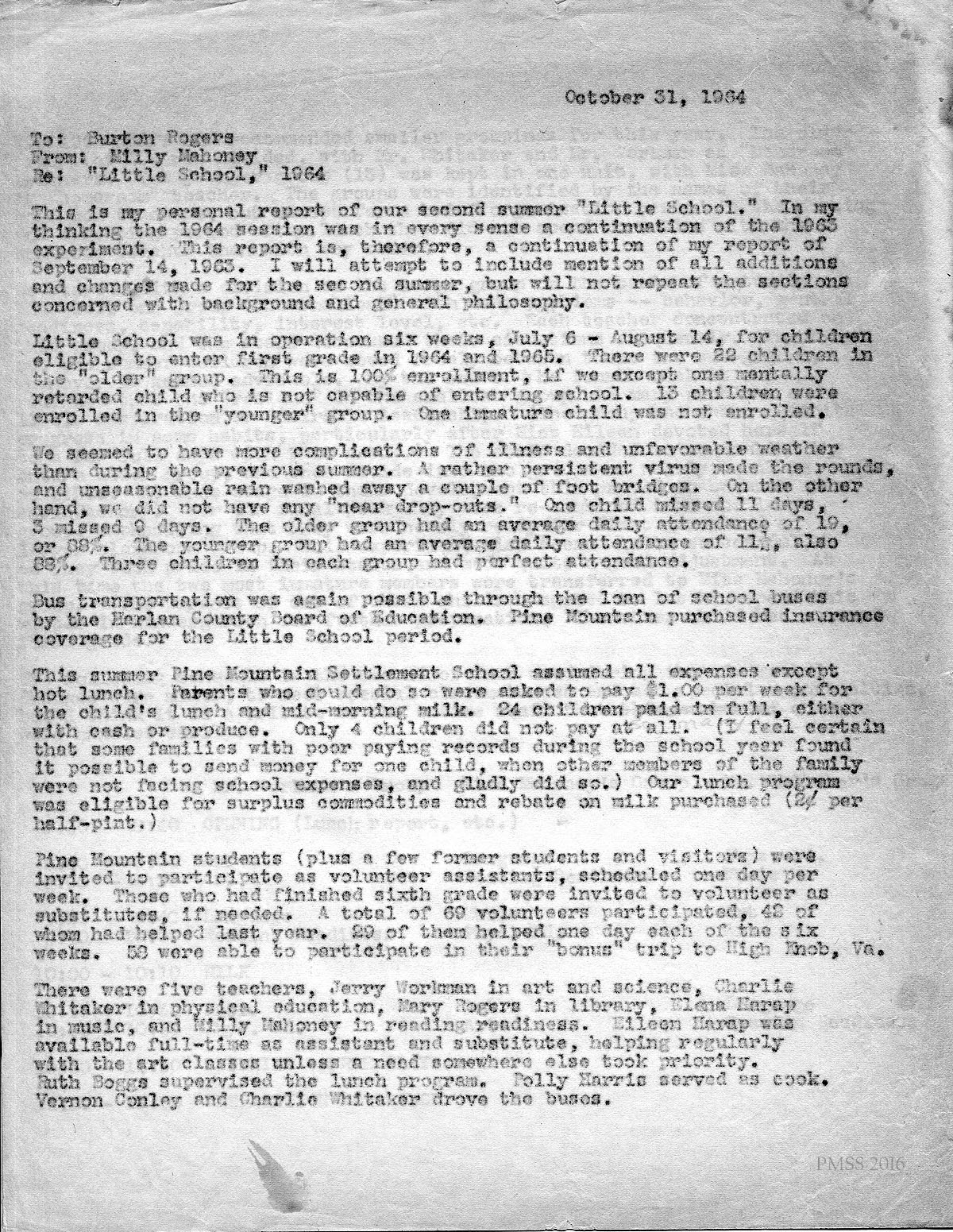 Mary Rogers in her The Pine Mountain Story (1980) describes the “Little School” of the 1960s: