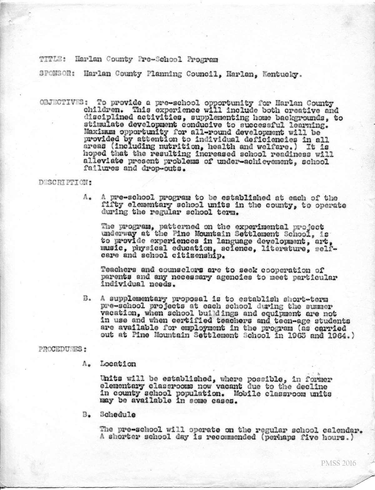Little School at Pine Mountain was begun in 1963, two years before the national Head Start program was sanctioned. It might be considered as a pilot of the national program as it followed many of the same guidelines as the later national program. While the national program had been shaped largely by needs identified in urban environments, eastern Kentucky was rural. Children in rural environments sometimes had additional challenges such as isolation from peers and little opportunity to engage peers in daily interaction, lack of experience with supervision other than a family member or relative, and little knowledge of the expectations of a public school setting. Studies were beginning to demonstrate that early intervention in a preschool program could give the younger children a better chance at engaging the demands of public schools with success if there were early intervention and support.