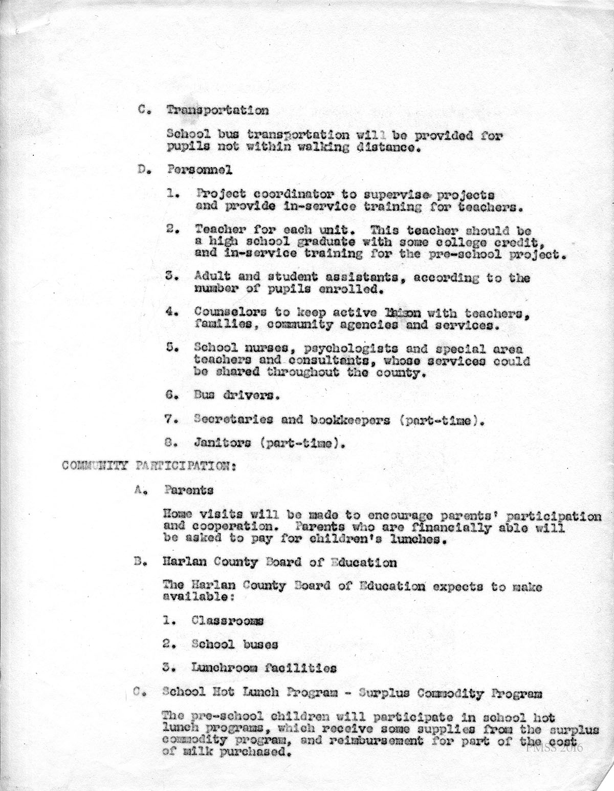 Their older brothers and sisters worked with them as volunteers, conducting them from place to place, helping with their clothes, preparing and serving their meals, and presenting reading readiness activities. Through this service the older ones learned more about child care, discipline and education, as bona fide staff members, than they could have learned in a year sitting at desks as pupils. After two years of Little School in the summer, Pine Mountain decided to sponsor and finance a year-round pre-school. Two years later this was funded by Title l.