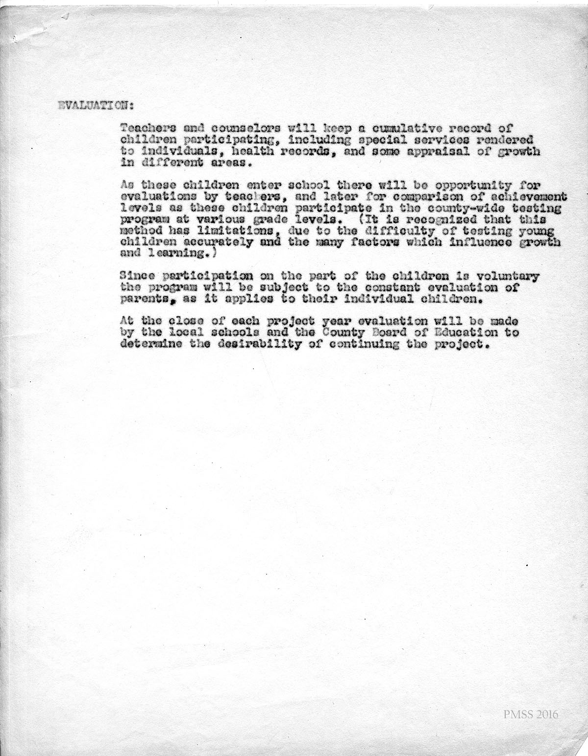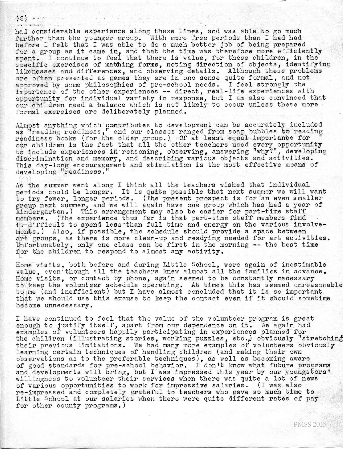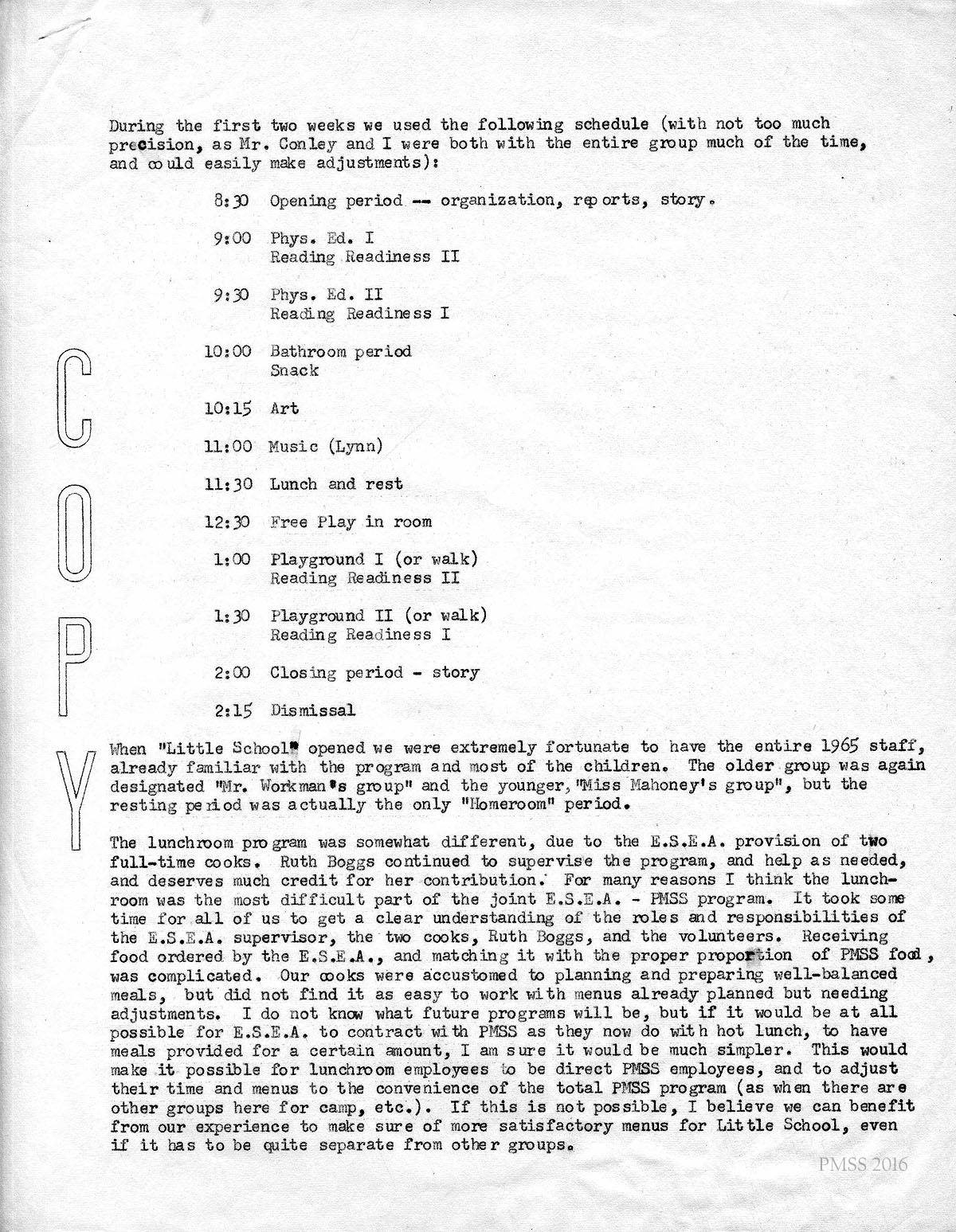 The national Head Start program was administered by the United States Department of Health and Human Services. The program was launched by the Office of Economic Opportunity‘s Community Action Program as an eight-week summer program in 1964. According to History PMSS Summary 1963-1964: “A summer ‘Little School’ was organized as a pre-school experience for 46 4 to 6-year-olds. Four PMSS teachers and 62 volunteer aides from Grades 7 – 10 provided an exciting school readiness experience for these youngsters.”