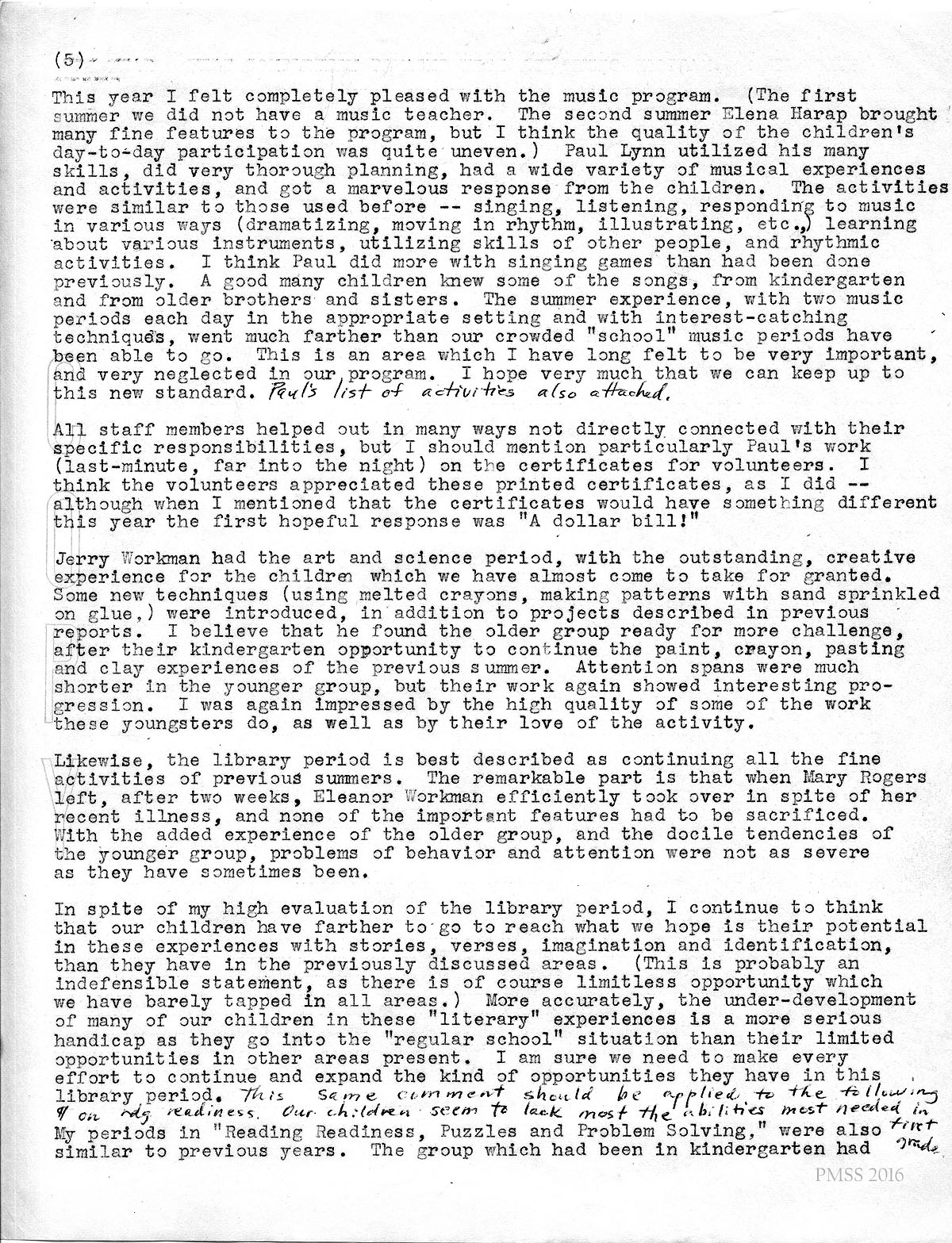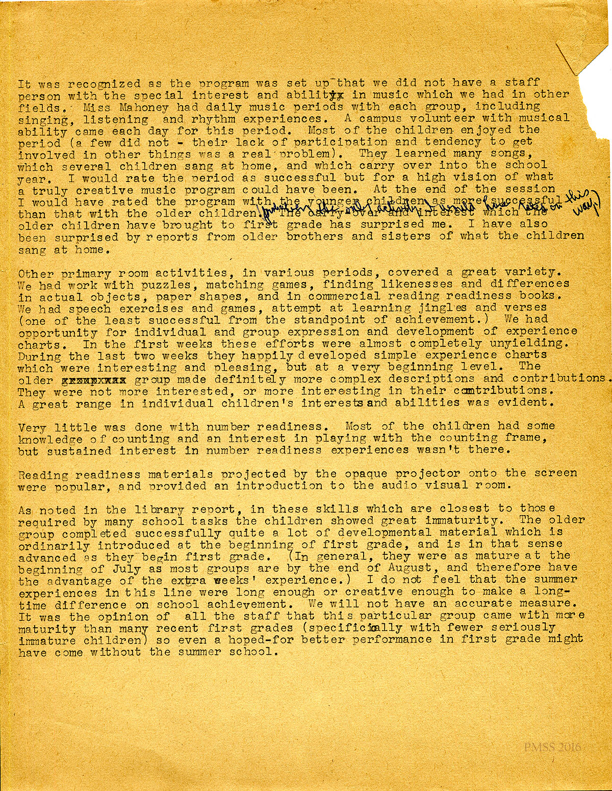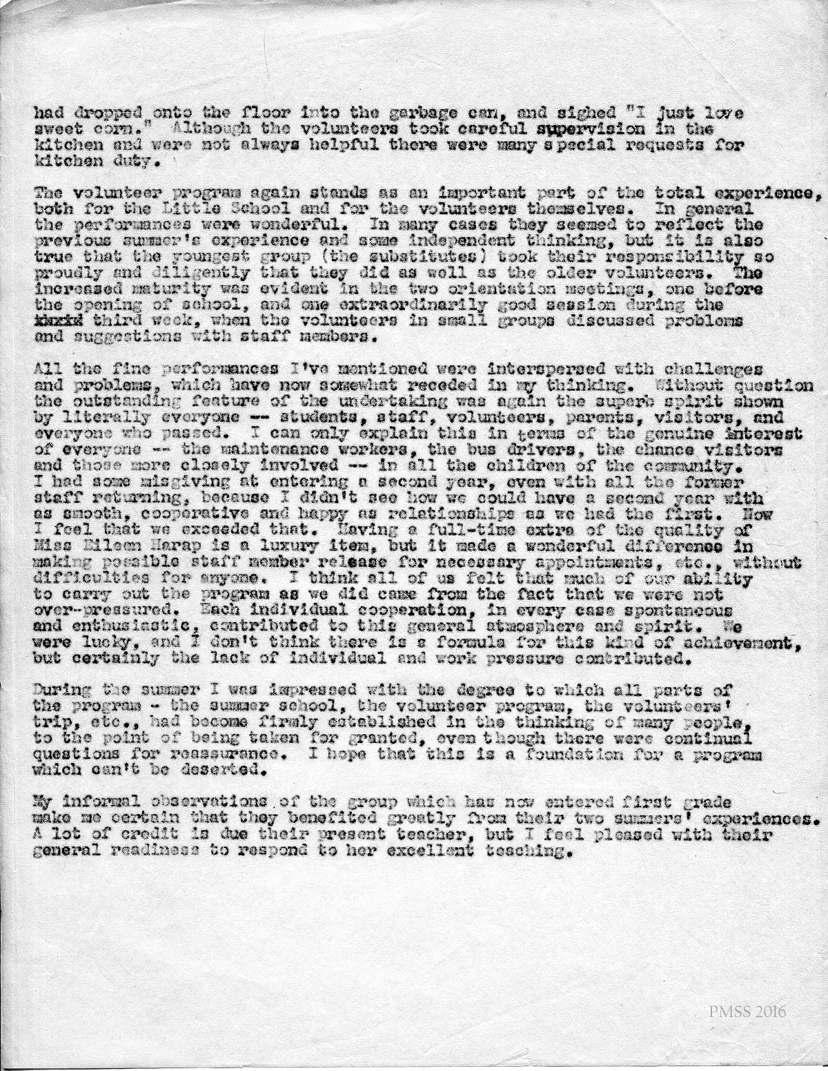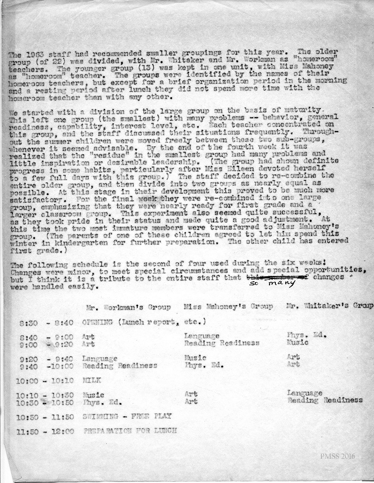 The national Head Start program was administered by the United States Department of Health and Human Services. The program was launched by the Office of Economic Opportunity‘s Community Action Program as an eight-week summer program in 1964. According to History PMSS Summary 1963-1964: “A summer ‘Little School’ was organized as a pre-school experience for 46 4 to 6-year-olds. Four PMSS teachers and 62 volunteer aides from Grades 7 – 10 provided an exciting school readiness experience for these youngsters.”