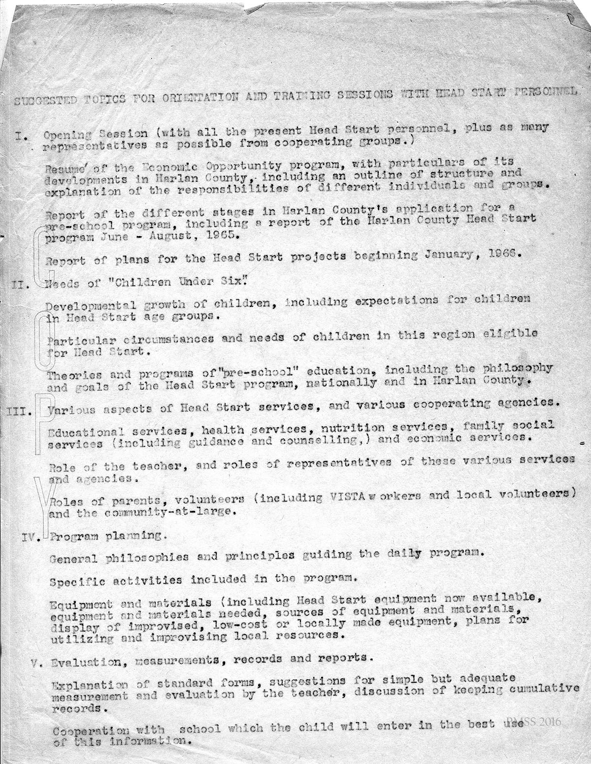 Little School at Pine Mountain Settlement School pre-dated the institution of the national Head Start program by almost two years and some have suggested that it was the first “head start” program in the country. Established in 1973 the Pine Mountain Program was conceived by Mildred Mahoney, a teacher at Pine Mountain in the Community School, and Burton Rogers, the Director of Pine Mountain Settlement School and a Yale graduate. While earlier than the national initiative, the Pine Mountain program was founded on many of the same principles as those established by Dr. Robert Cooke, a pediatrician at Johns Hopkins University, who had received his undergraduate degree at Yale and Dr. Edward Zigler, a professor of psychology and later director of the Yale Child Study Center . It is Zigler who has been described as the “father” of the national Head Start program, but as Dr. Robert Cooke describes it in his oral history, the idea for Head Start* began with Susan Gray, a teacher at Peabody College in Nashville. It was carried forward by Zigler and Cooke as part of the War on Poverty programs.
