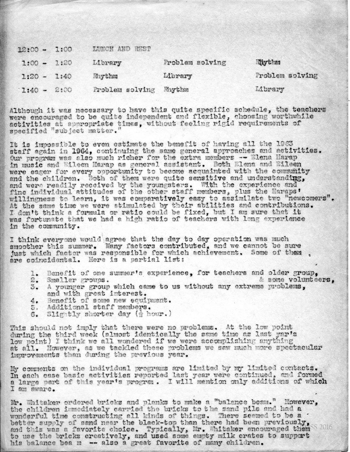 In 1963 a “Little School” was organized for the summer months. To staff it, help was sought from sixth to tenth-grade students. Amazingly, nearly all of the eligible ones (over sixty of them) volunteered. The home of every pre-school child was visited more than once to familiarize parents with the idea, and to acquaint children with their teachers, parents promised contributions in kind to furnish a hot lunch. Exciting weeks followed as small students learned to play together, eat together, and to take naps. They went for science walks about the grounds and in the woods; they listened to stories and looked at books in the library; in art lessons they experimented with lots clay and finger paint; they had reading readiness sessions; they sang songs and listened to music. They played on the playground and tried out the swimming pool.