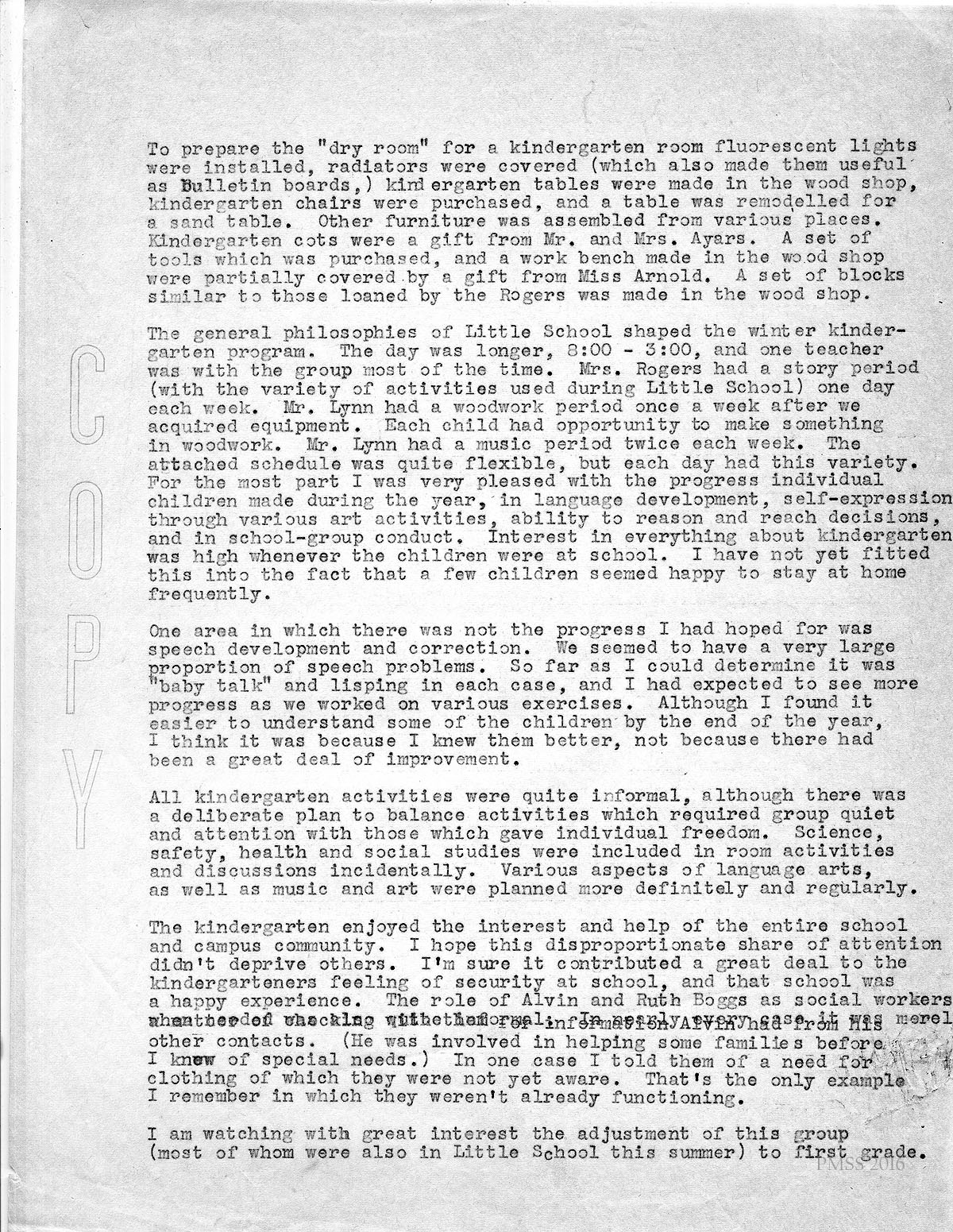 No doubt Miss Willett has told you a good deal about the work as it has been narrated by Miss Thomas to her. The Little School is primarily for a few of the local children who live too far away from the county school to make it convenient for them to attend…..Then too, the Little School takes care of a few of the children from our boarding school who cannot carry the work in the upper departments. It is highly individualized work and requires a good deal of resourcefulness and initiative….