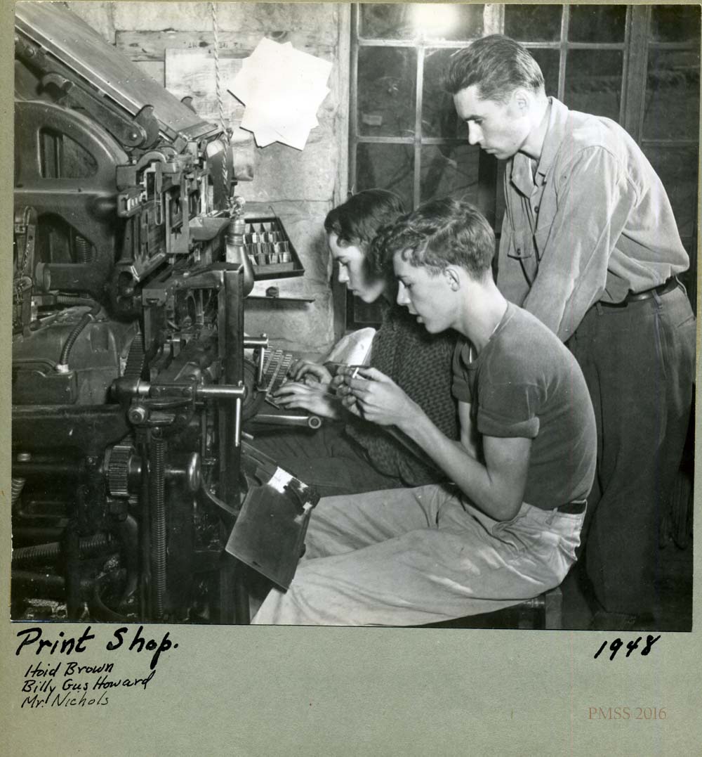 To expand the School’s industrial arts curriculum, a print shop was proposed by Morris for the campus, knowing that such an enterprise would not only provide students with a trade but also benefit the School financially as well. No longer would the School have to pay an outside company for its many and various printing needs or relinquish control of the publication process to that company. In addition, a shop on campus would provide printing services for the community and bring some revenue to the School.