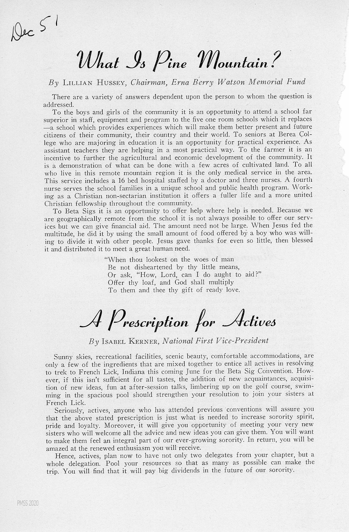 Katherine Pettit and Ethel de Long Zande, the co-founders, were first in a long line of people dedicated to service at Pine Mountain. They did all “have heart and cravin'” to see the school expand and the program change to fit the growing needs of the mountain community. How it can best serve in the future remains to be seen, but one thing seems certain: the school will be needed not less but more in the years to come. We, too, should commit ourselves to the fulfillment of Uncle William’s cravin.’ How can we do this? By following the advice found in Proverbs 3:27 “Do not withhold good from those to whom it is due, when it is in your power to do it.” We who are geographically remote from Pine Mountain cannot offer services to the school but it is within our power to provide the money needed in ever increasing amounts to make it possible for those near at hand to do more and more good. When the request for donations to the Erna Berry Watson Memorial fund goes out to active and alumnæ chapters may each Beta Sig “have heart and cravin'” to do all in her power to encourage every chapter to make a donation, larger than they have ever made before.