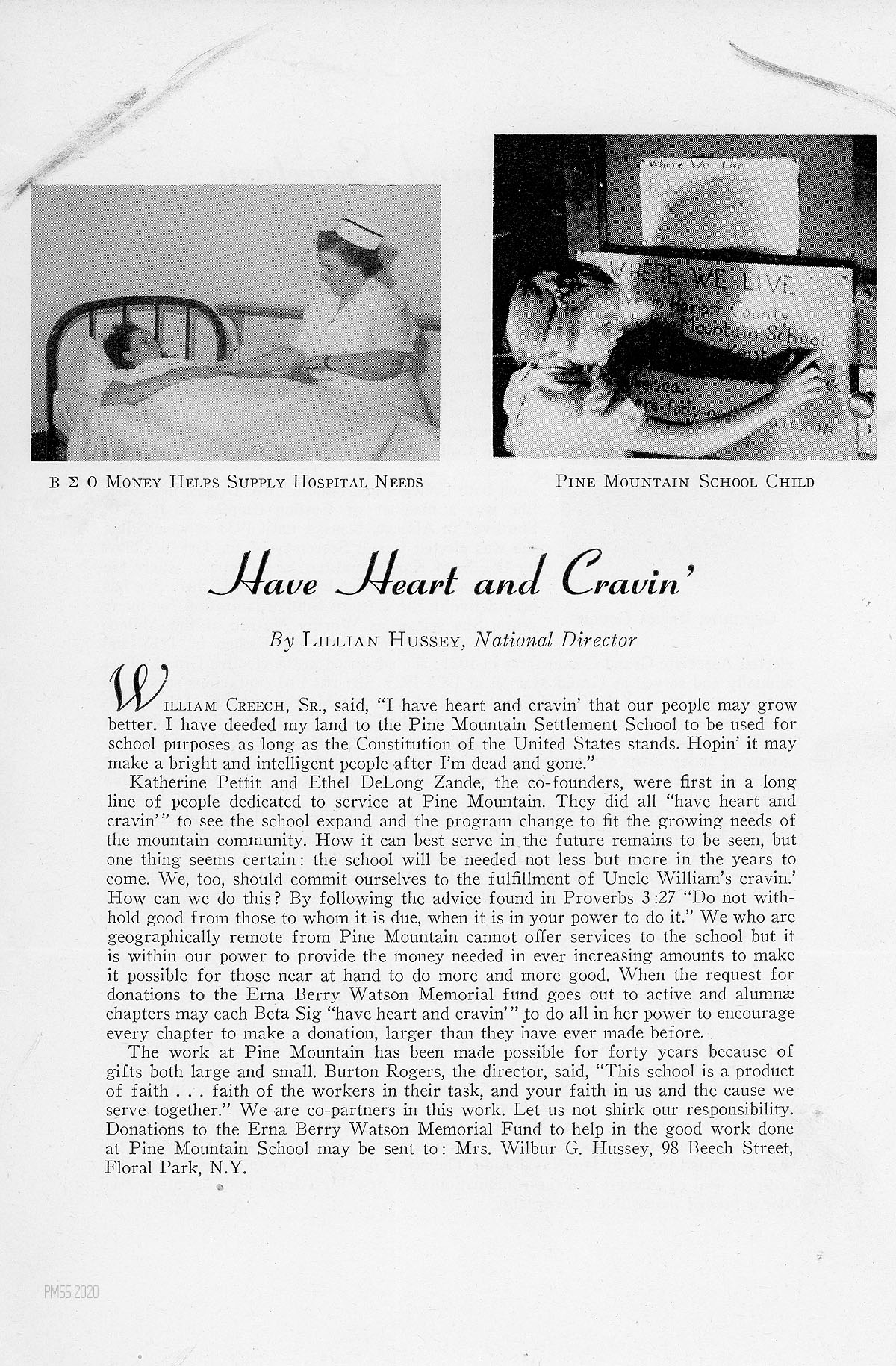 The work at Pine Mountain has been made possible for forty years because of gifts both large and small. Burton Rogers, the director, said, “This school is a product of faith … faith of the workers in their task, and your faith in us and the cause we serve together.” We are co-partners in this work. Let us not shirk our responsibility. Donations to the Erna Berry Watson Memorial Fund to help in the good work done at Pine Mountain School may be sent to Mrs. Wilbur G. Hussey, … Floral Park, N.Y.