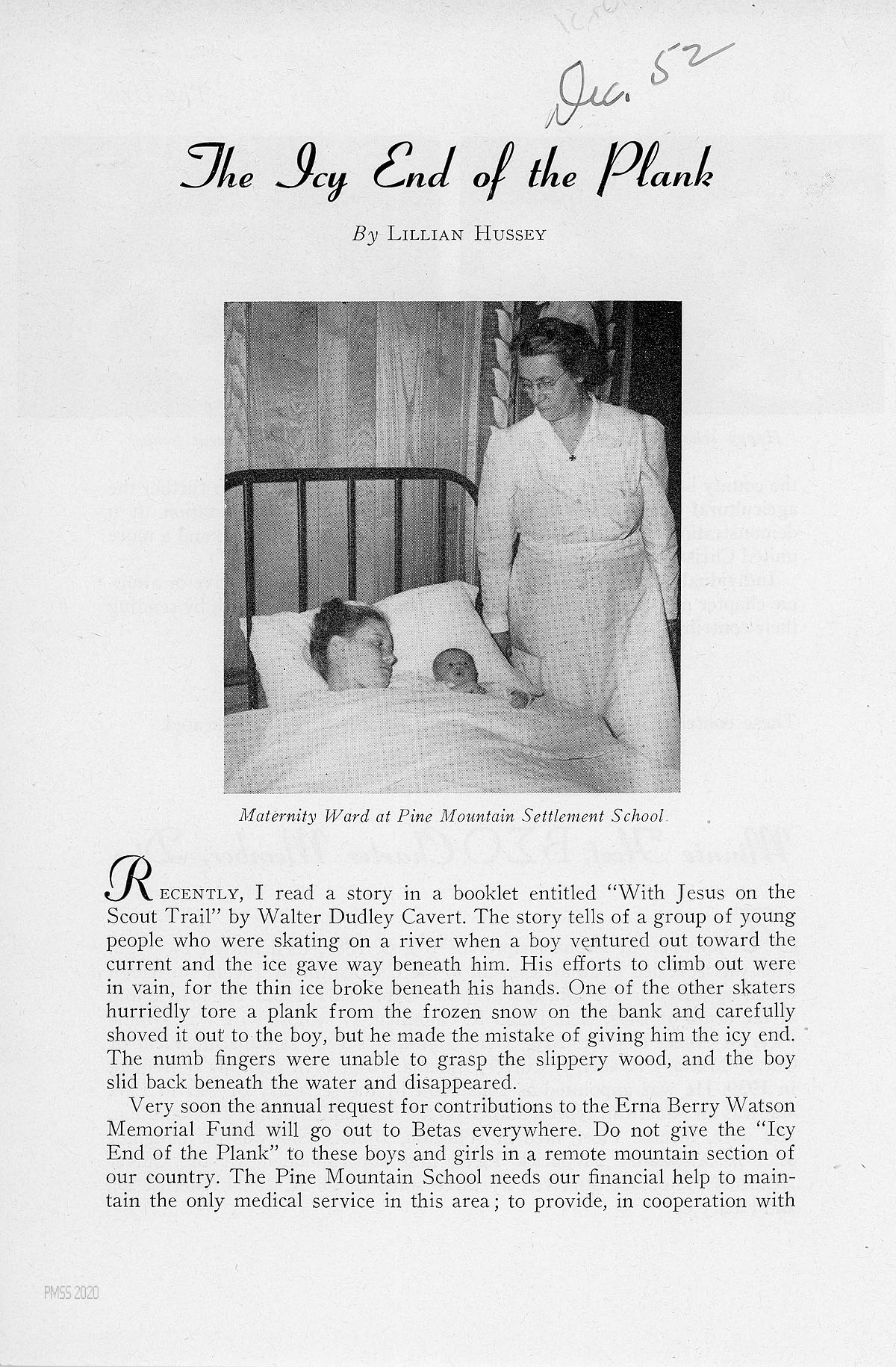 Very soon the annual request for contributions to the Erna Berry Watson Memorial Fund will go out to Betas everywhere. Do not give the “Icy End of the Plank” to these boys and girls in a remote mountain section of our country. The Pine Mountain School needs our financial help to maintain the only medical service in this area; to provide, in cooperation with