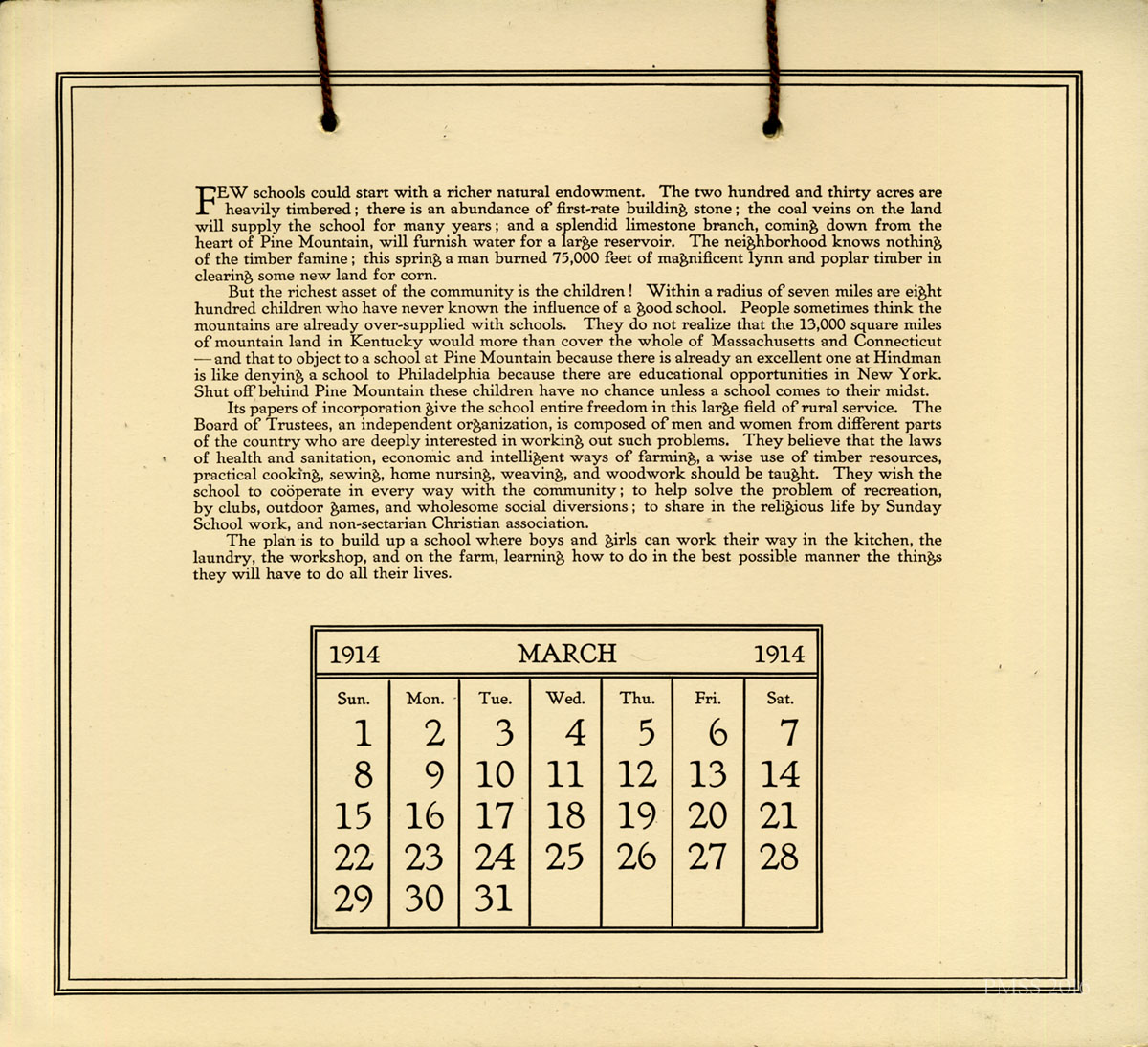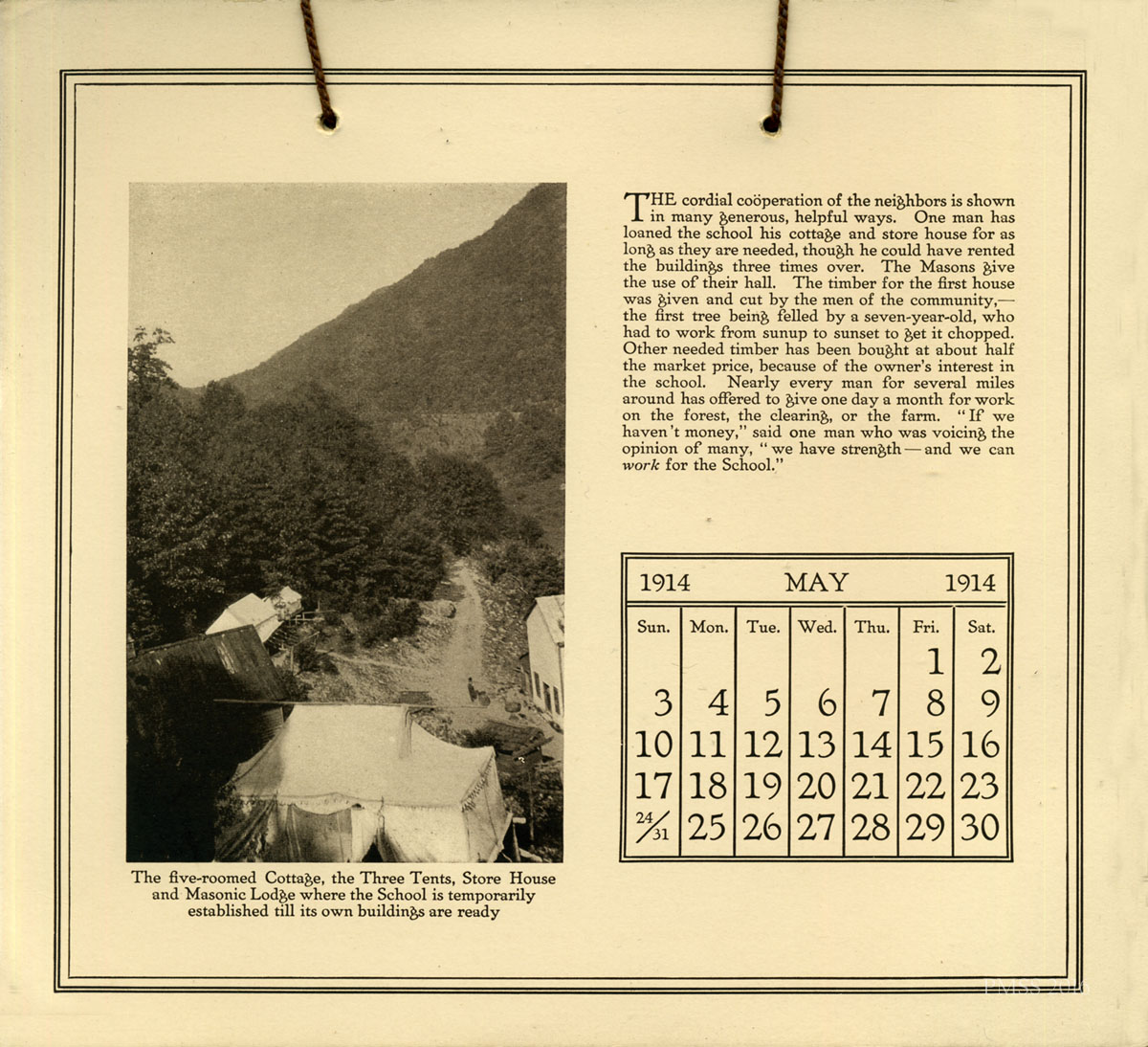 The first calendar published by the Settlement School, the 1914 calendar served as both an appeal instrument as well as a gift and first-year update. The calendar is important for its very early photographs of the School and its development and for establishing an annual contact with supporters of Pine Mountain Settlement School and its programs.