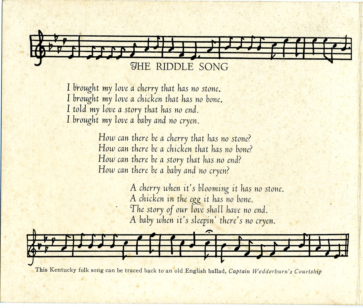 Song, ballad, lullaby, “The Riddle Song” is distinguished from so many mountain ballads that seem to find their subject in murder, deaths, and burials, and perhaps that accounts for its popularity at the School that tried to point students to a more gentle side of human nature rather than the pervasive fatalism.