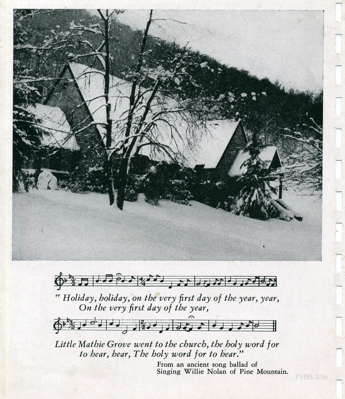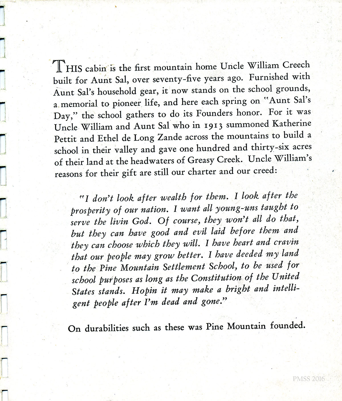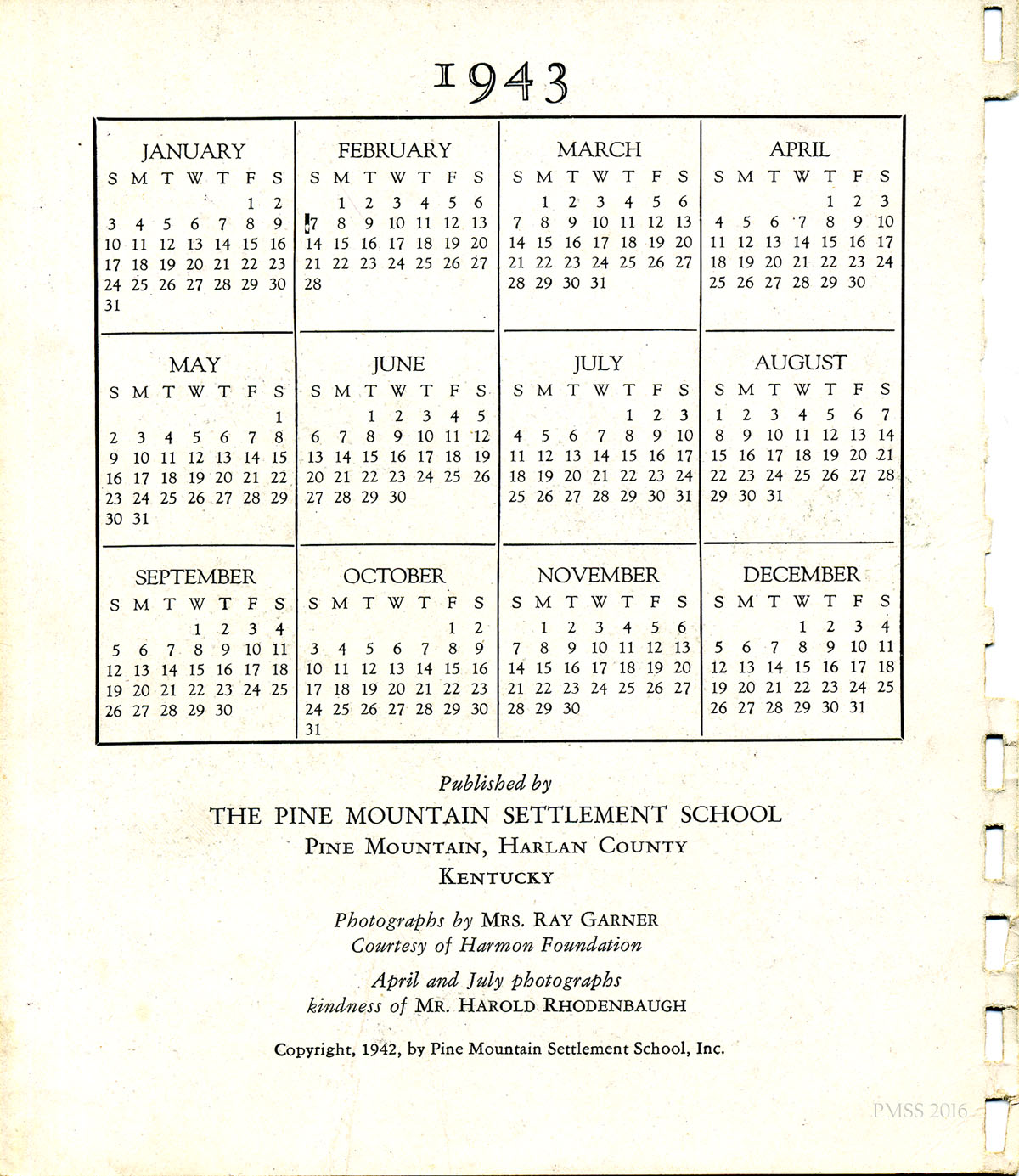 The 1943 spiral-bound calendar features quotes of the School founders as well as various photographs representing Pine Mountain Settlement School and the surrounding community in the early 1940’s. The photographs are by Arthur Dodd the staff photographer and Principal and instructor at the School.. During his tenure at the School.”Dodd,” as he was called, created many images that were used in publicity and promotion of the institution.
