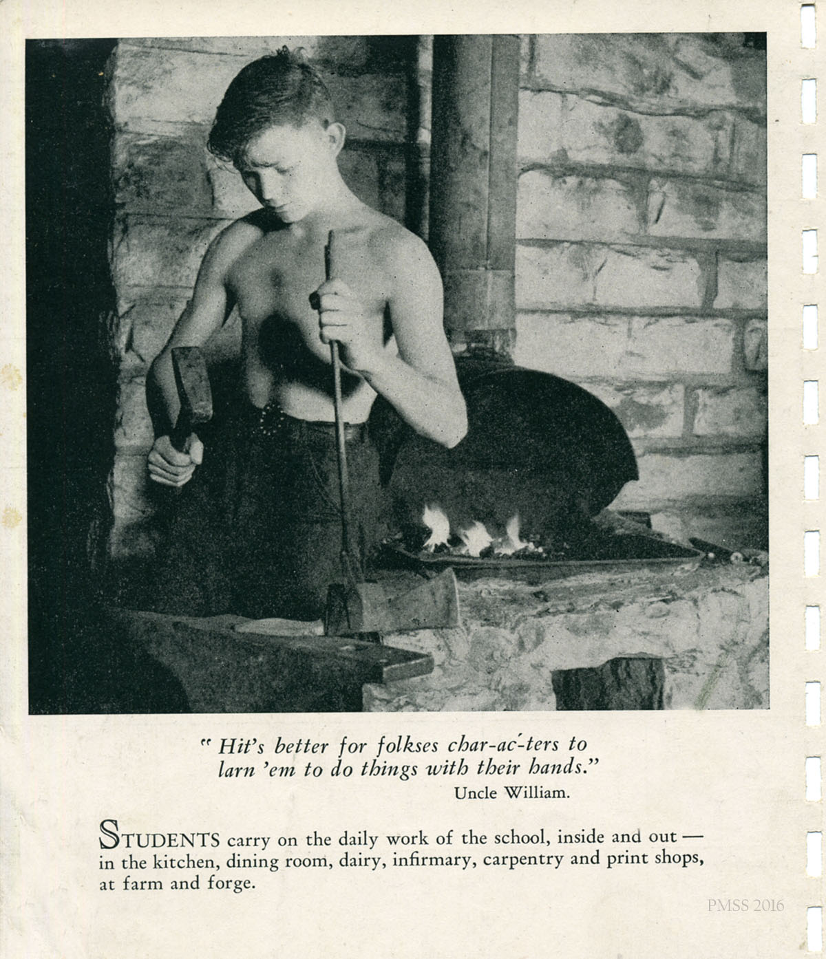The images here are familiar buildings at Pine Mountain as well as other images taken in the community surrounding the School. Some photographs depict students working in the innovative community out-reach program that developed practical life skills as well as well as vocational training. The program attracted a great deal of attention from national educators as well as government programs that were looking for ways to more fully engage rural communities and their students. The educational programs at Pine Mountain during the years following WWII produced some of the most outstanding educational training and social work within the rural settlement movement.