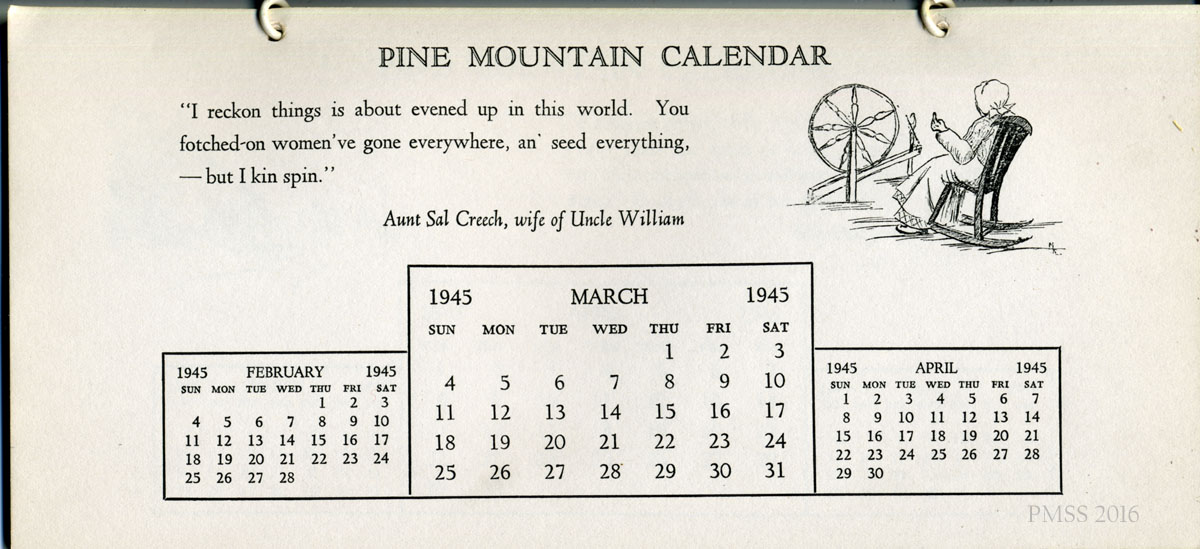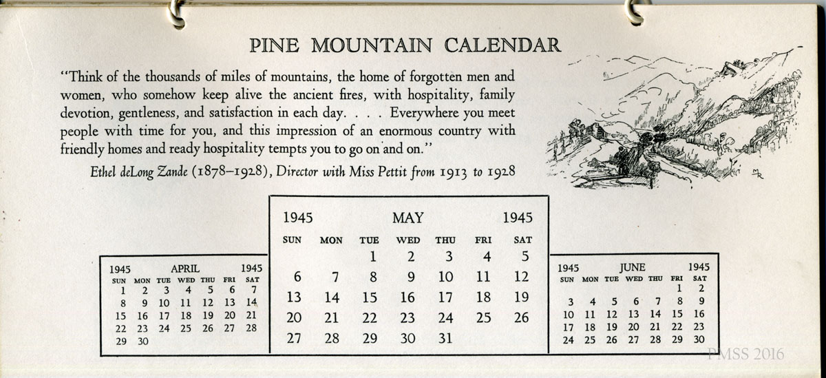 1945 CALENDAR displays images of each month of the Pine Mountain Settlement School Calendar and Mary Rogers‘ illustrations that accompanied the pages. Mary Rogers was a housemother from 1942 to 1945 and teacher, artist, naturalist, volunteer librarian, and the Environmental Education supervisor of community outreach, during the years of 1947 to 1993. Her art may be found across much of the promotional literature of the School from 1947 onward.
