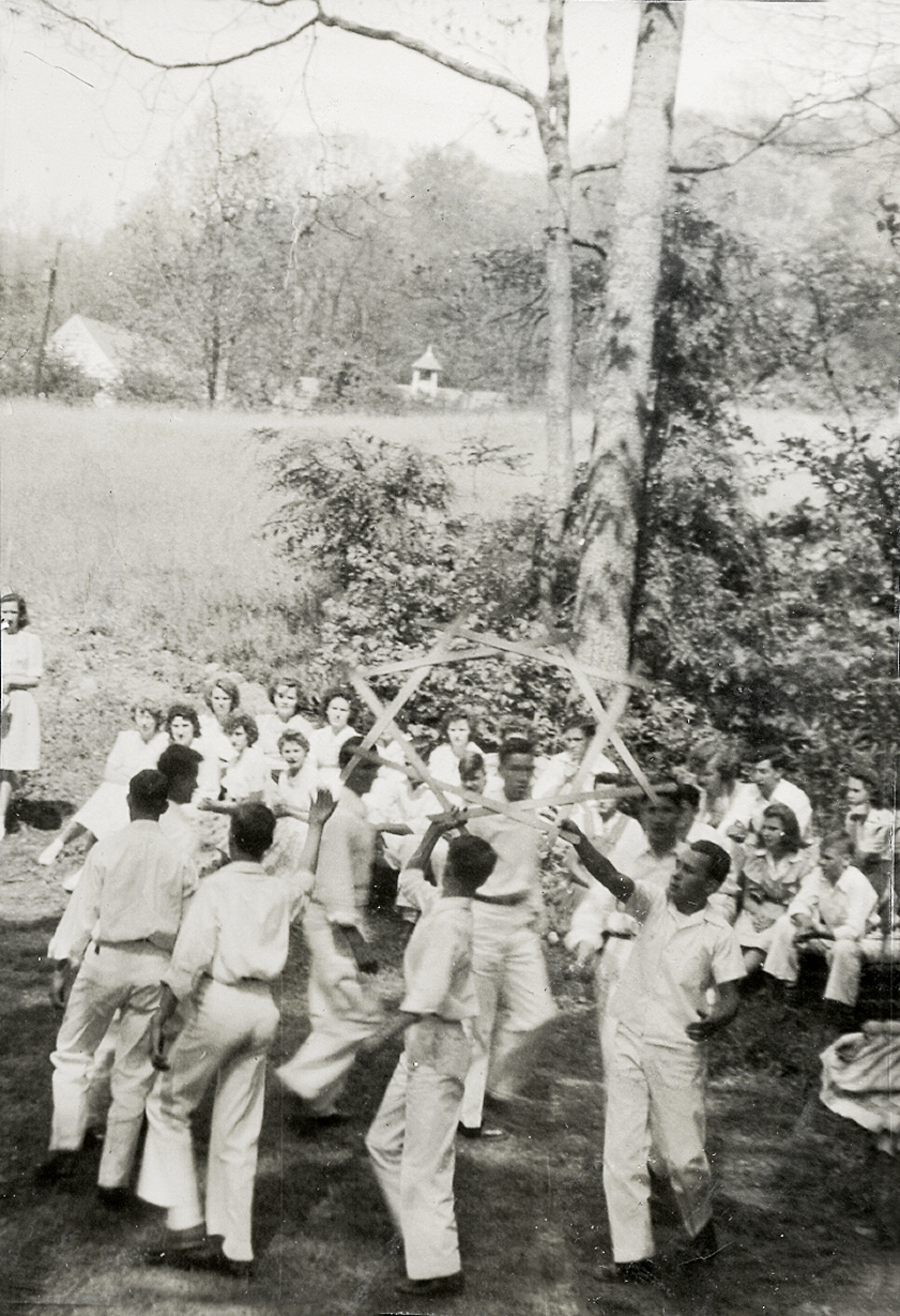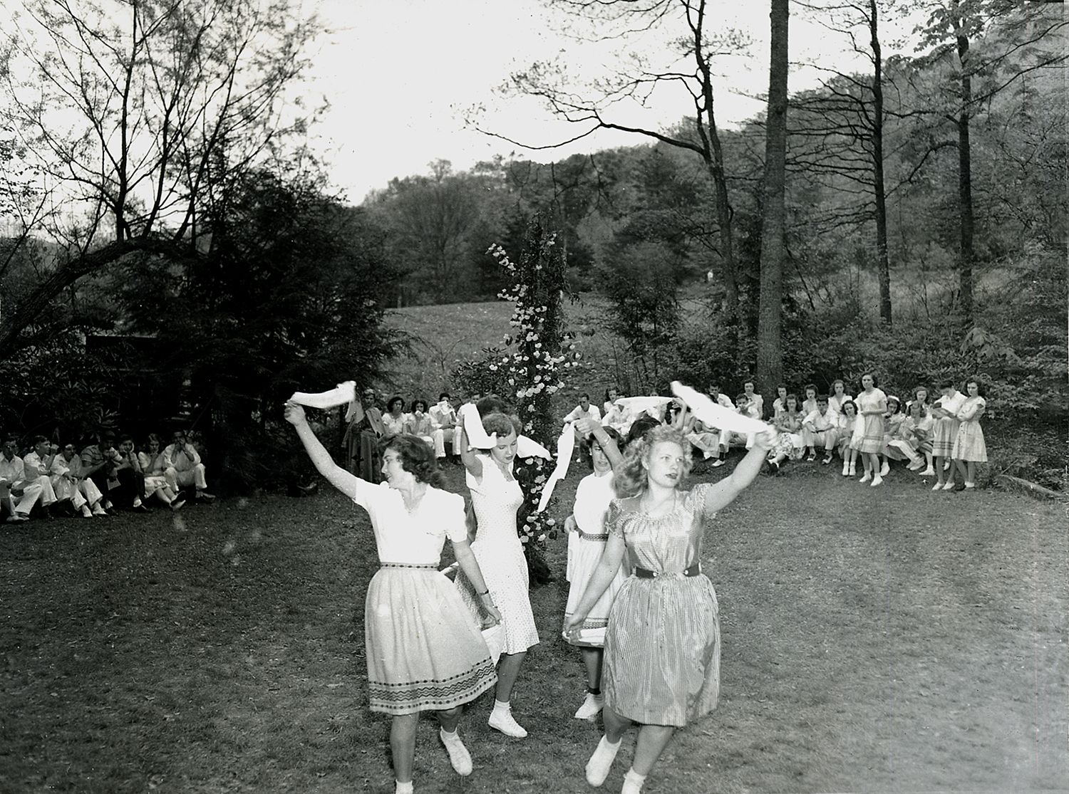 Pine Mountain’s celebration of May Day borrowed heavily from the traditional Celtic-English celebration of May Day by adopting many of the English Country dances, the Morris dances, the ribboned May Pole, and the characteristic white dress of the May Day participants. Many of the Pine Mountain staff were very familiar with the North Eastern May Day festivities that incorporated dances learned from the English Country Dance Society that was active on the campuses of many colleges and universities in the North East. Both Wellesley and Vassar had faculty and students who participated in English Country Dancing and followed the English Country Dance Society. Many of the staff, particularly Evelyn Wells, Dorothy Bolles, and Abbie Winch “Winnie” Christensen were avid followers of the English Country Dance Society, and came as guest instructors long after they had worked at the School. Many avid fans of English Country Dance were found at Berea College, which was continues as a long associate of Pine Mountain Settlement School.