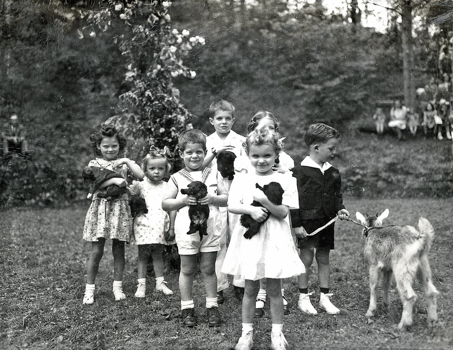 May Day celebration. c. 1945-46. From left to right with puppies and goat: ?, Helen Hayes, David Barry, Frank Barry, Kathy Barry, ? (hidden), Steven Hayes with goat, Elizabeth Dodd (front), daughter of the photographer, Arthur Dodd. [nace_1_022a.jpg]