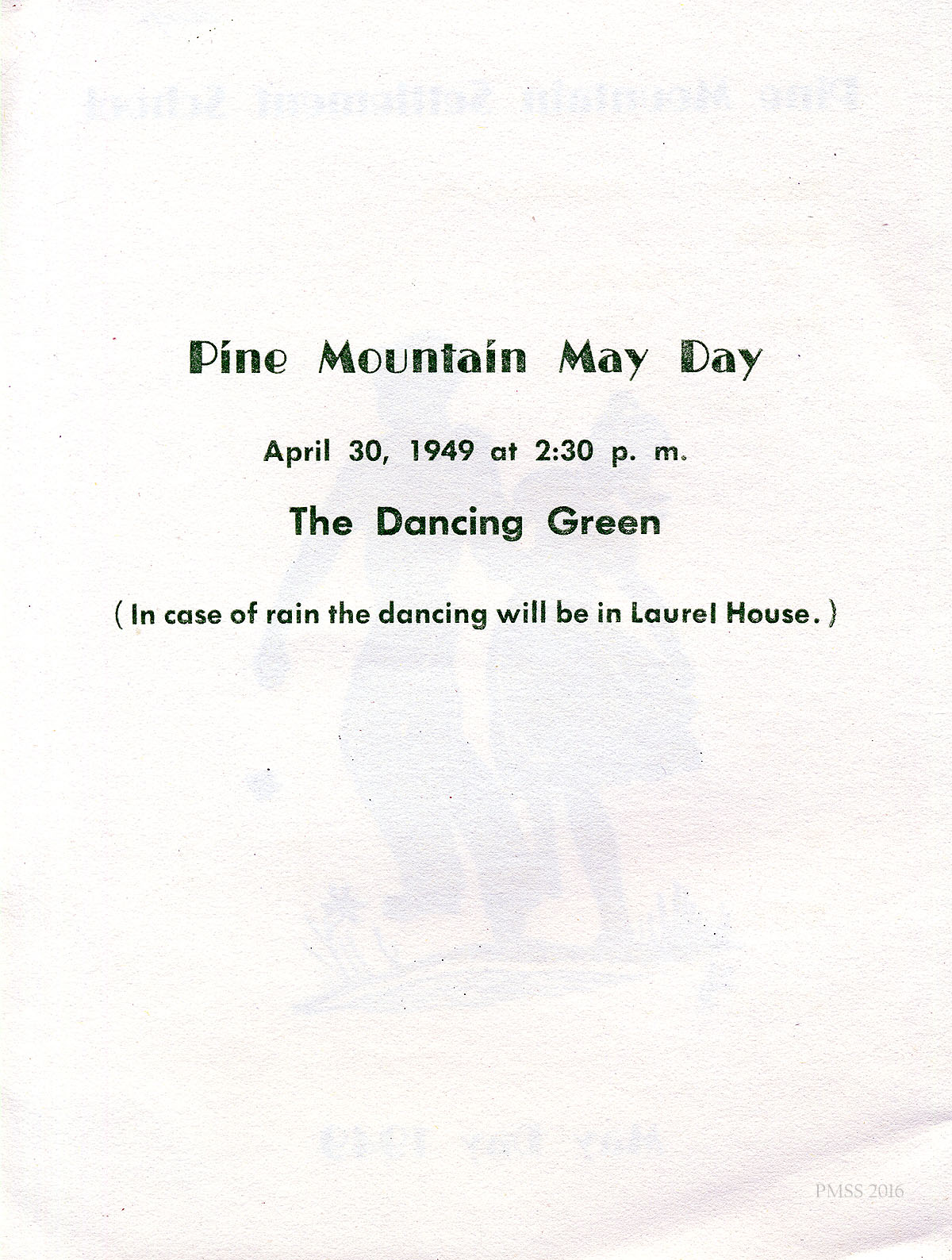 In 1949, the last year of the Boarding School, May Day was in full swing. A list of the typical dances to be performed during this celebration appear on the program for the event and include such favorites as Morris Dances (including the Bacca Pipes Jig); Hunsdon House; Picking- up-Sticks; The Weaver’s Dance (where all dancers are wearing something that they themselves wove); Cumberland Square Eight; Hole in the Wall; North Skelton Sword Dance; and others (see below). See the individual programs of May Day Celebrations at the School for descriptions of the dances and dancers. The last program of May Day 1949 is shown below.