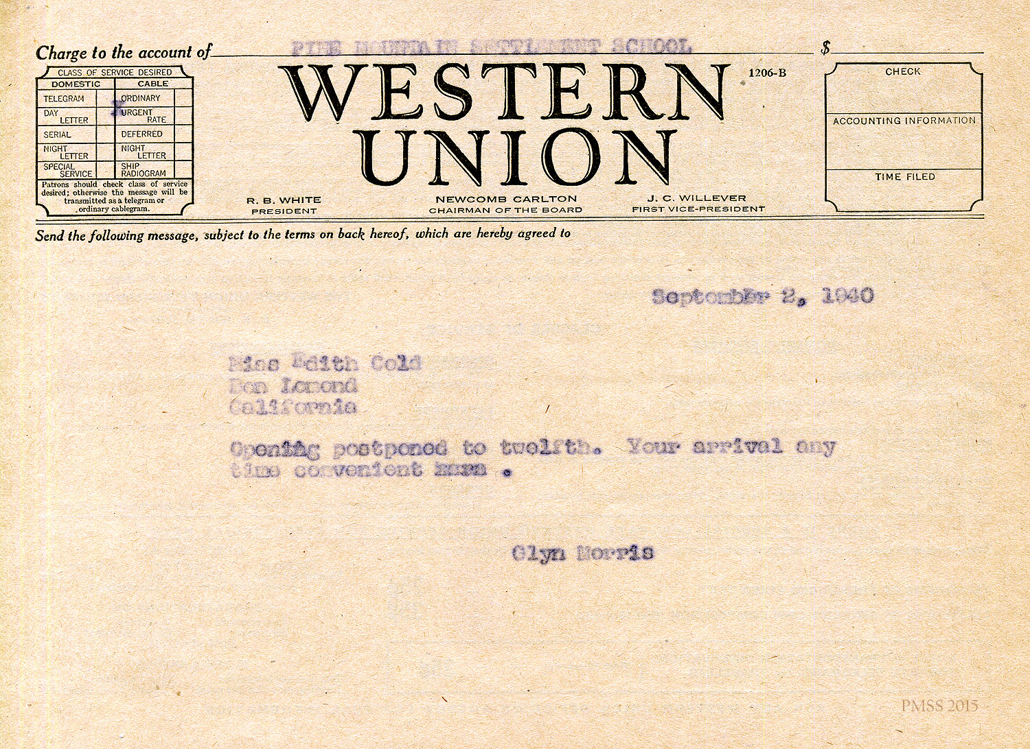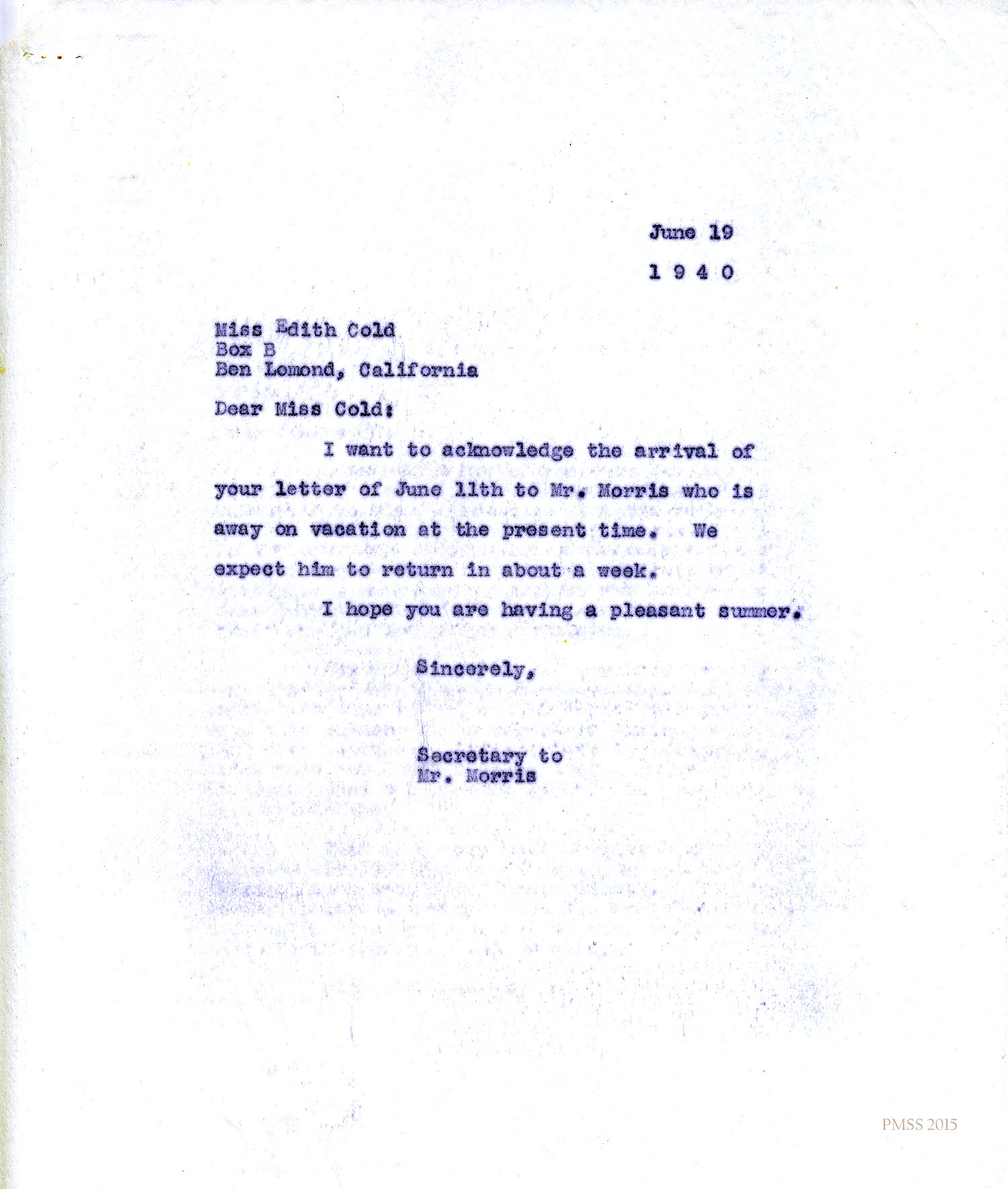 This little note is to say that Mr. Morris is still away from Pine Mountain but we are expecting him back this week-end so that you should have some word from him in a few days.