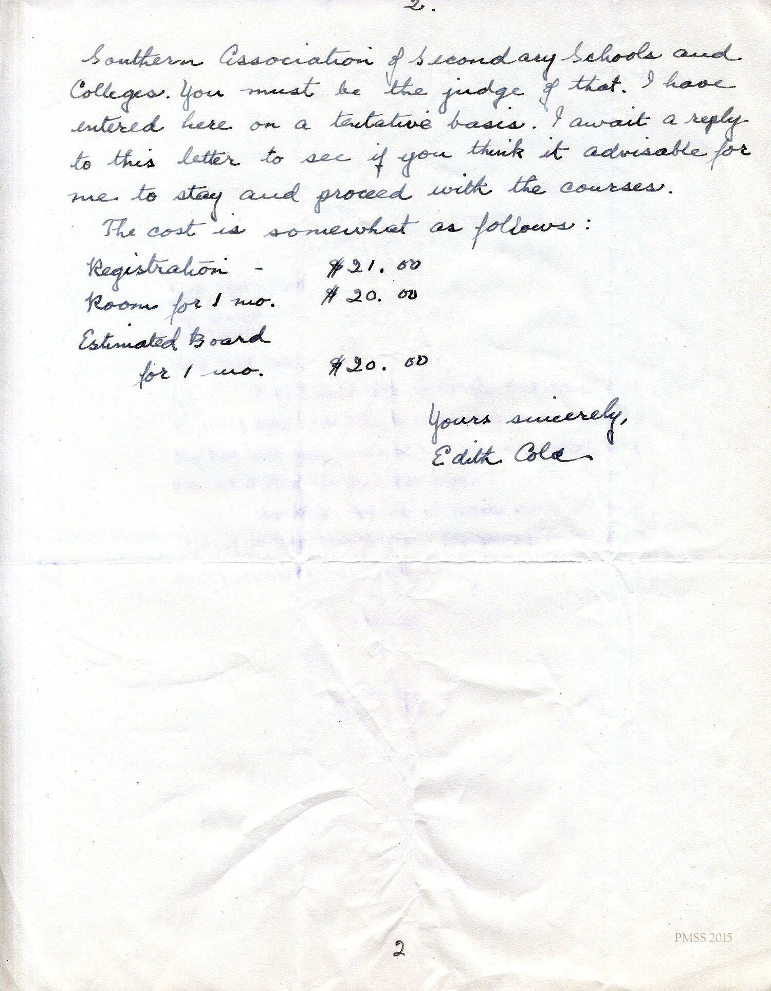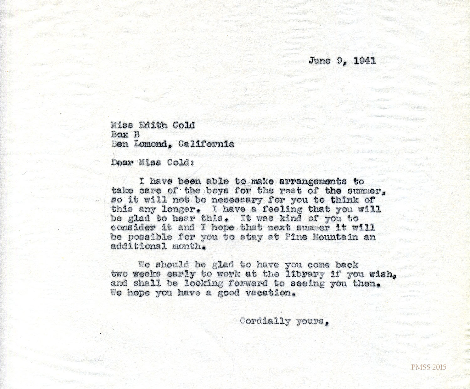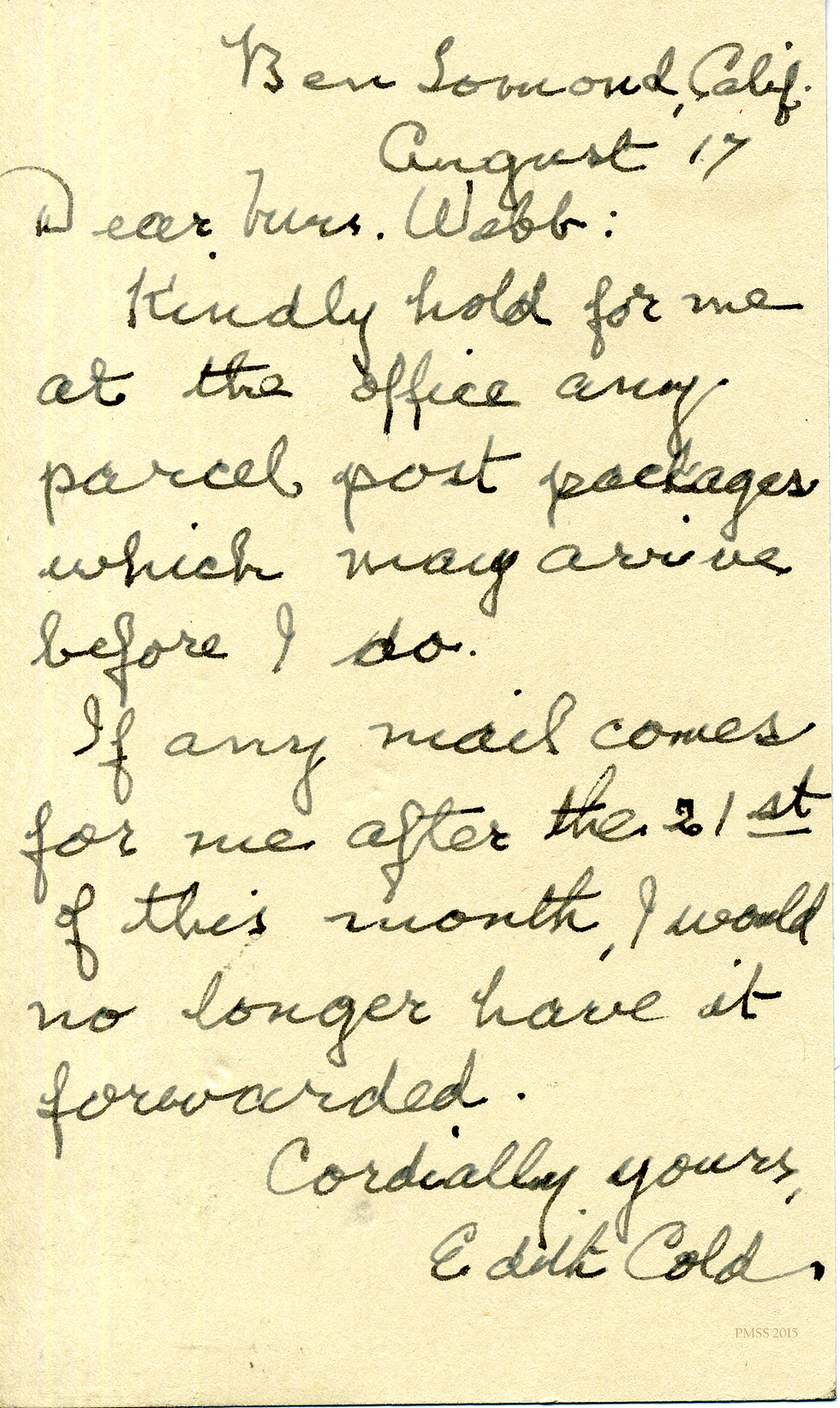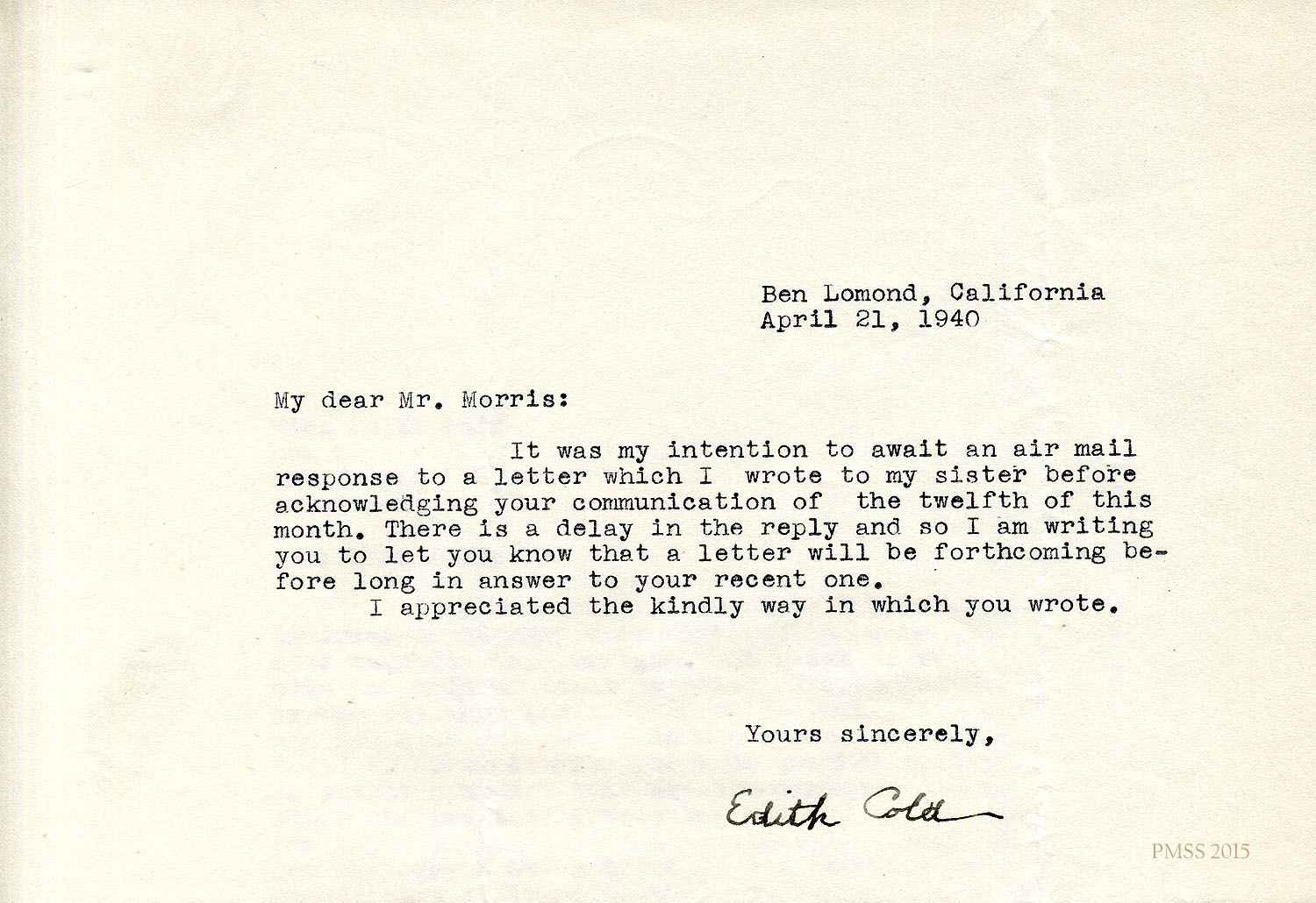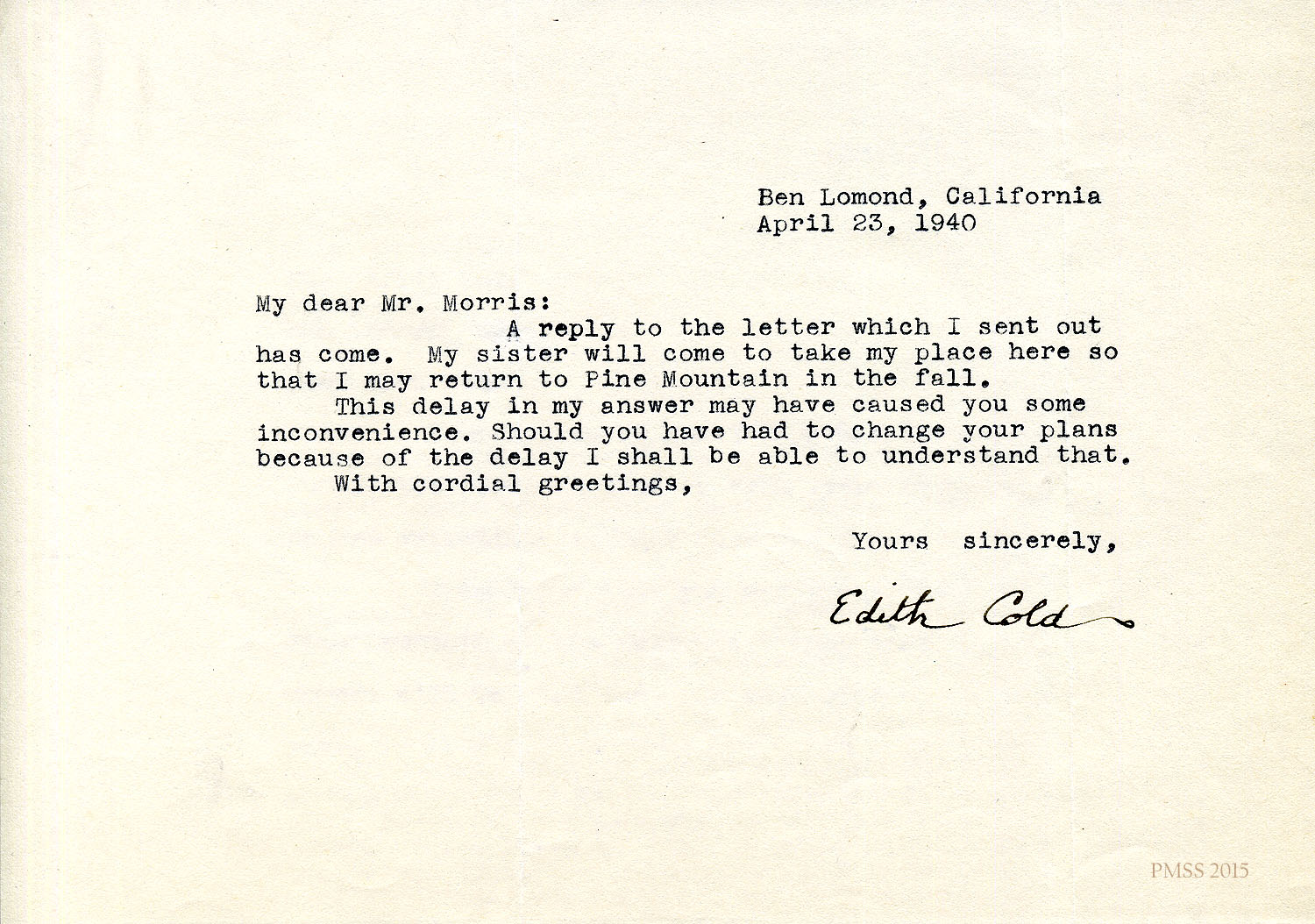 Sincerely, Edith Cold