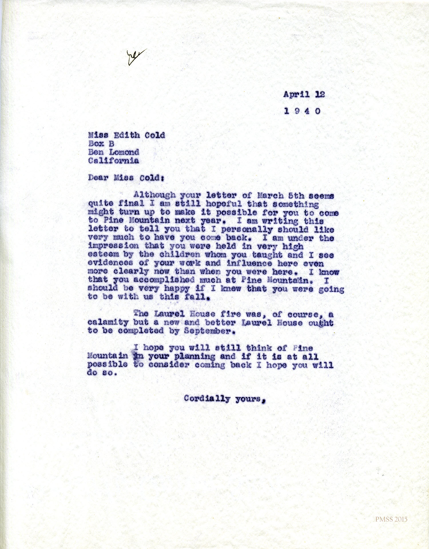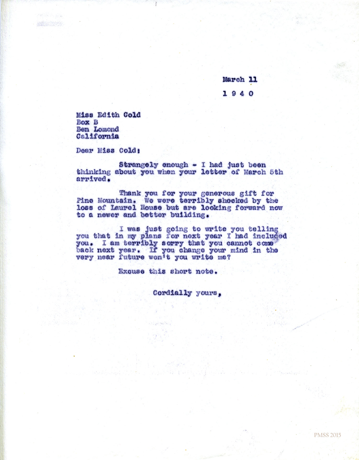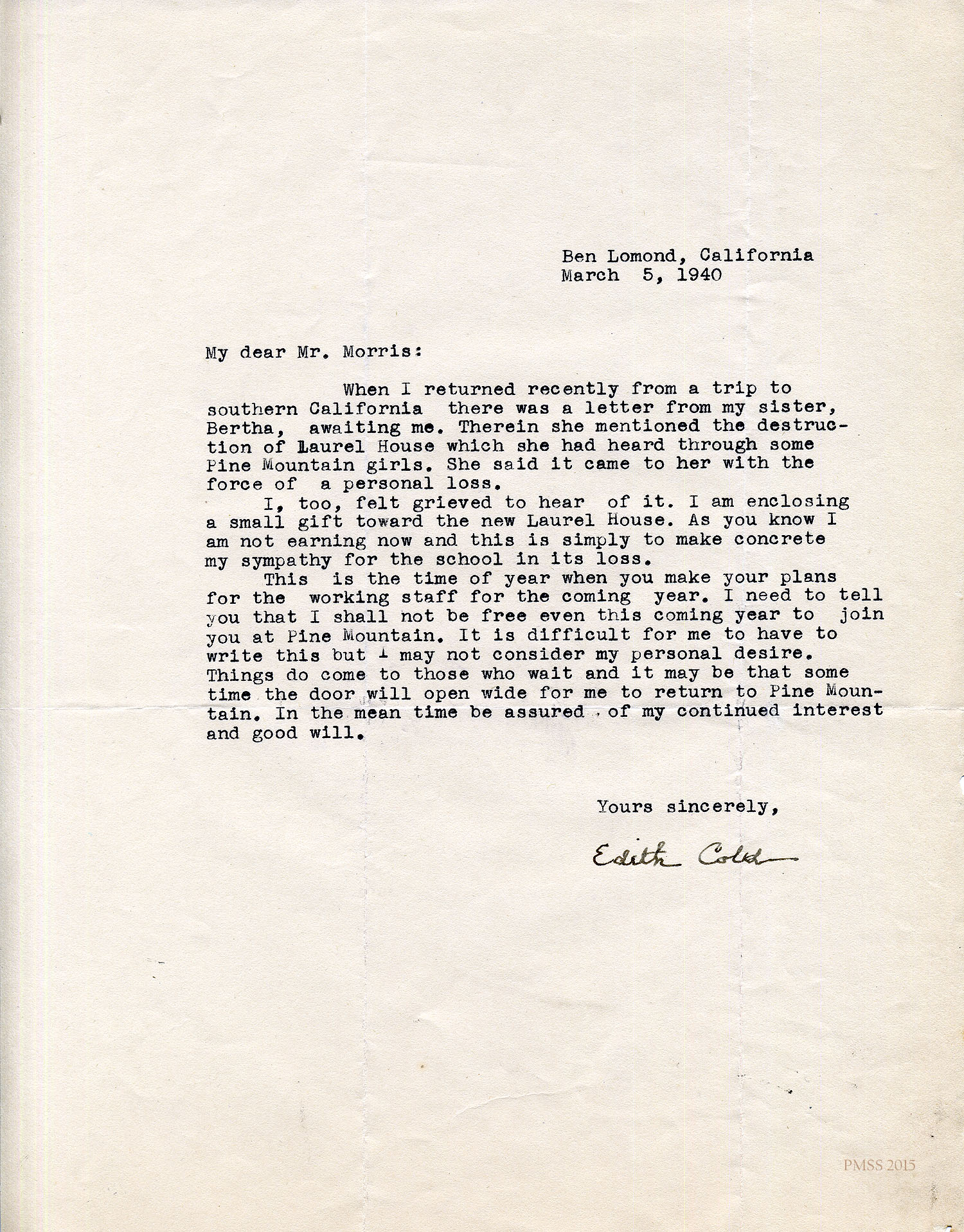 When I returned recently from a trip to southern California there was a letter from my sister, Bertha [Cold], awaiting me. Therein she mentioned the destruction of Laurel House which she had heard through some Pine Mountain girls. She said it came to her with the force of a personal loss.
