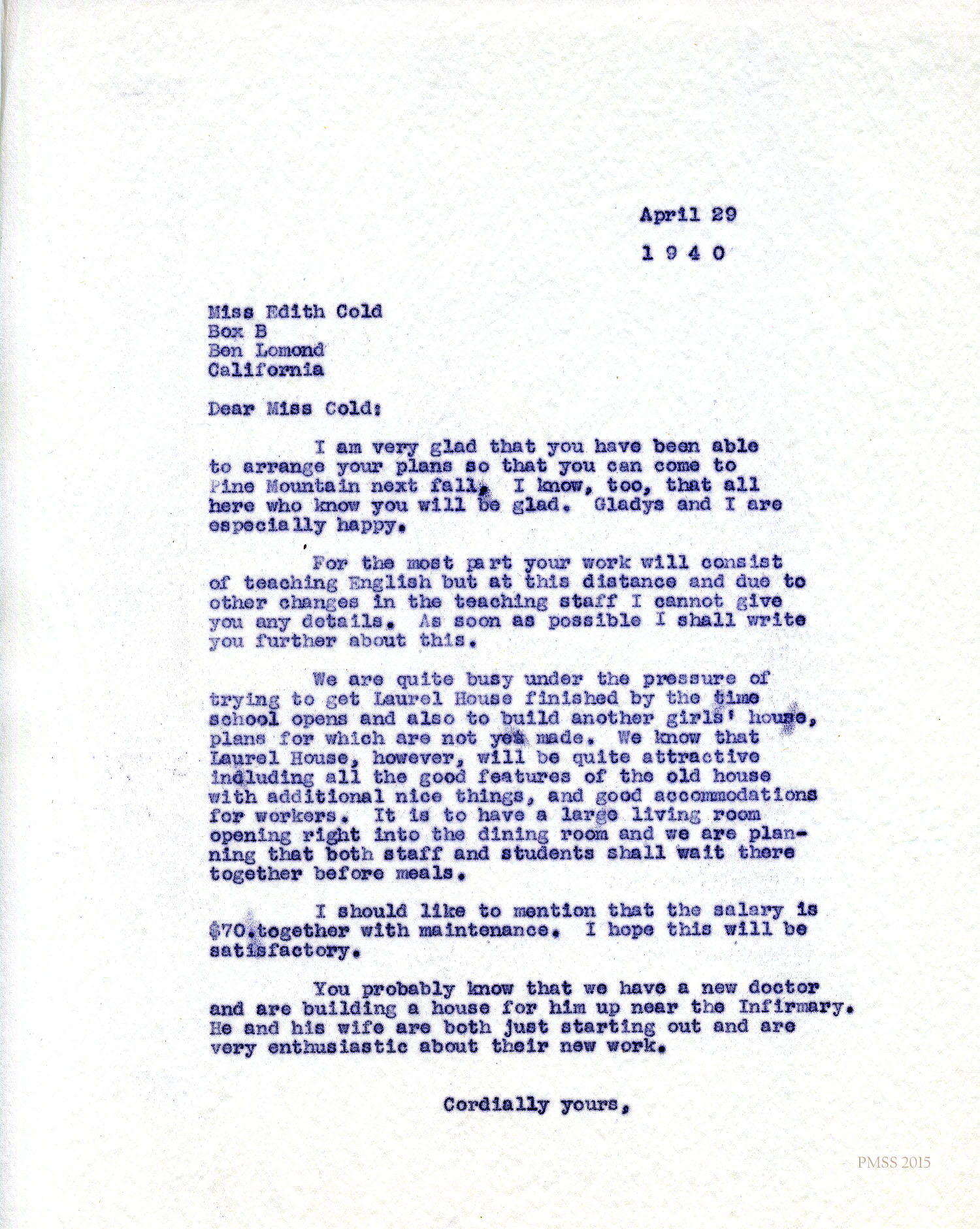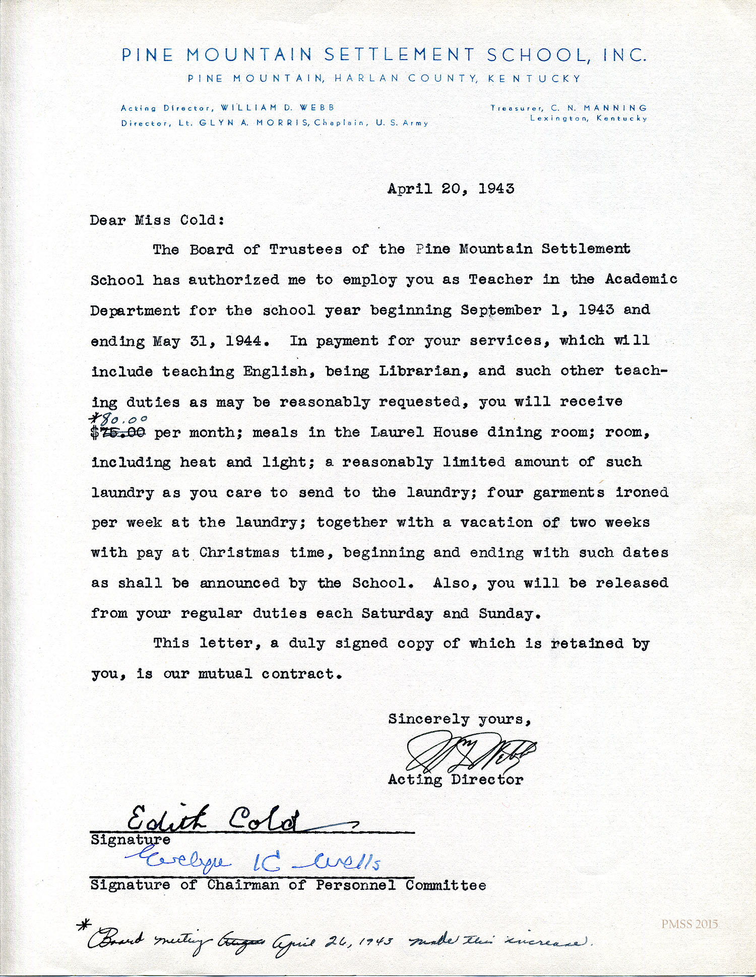 The Board of Trustees of the Pine Mountain Settlement School has authorized me to employ you as Teacher in the Academic Department for the school year beginning September 1, 1943, and ending May 31, 1944. In payment for your services, which will include teaching English, being Librarian, and such other teaching duties as may be reasonably requested, you will receive *$80.00 [$75.00 is crossed out] per month; meals in the Laurel House dining room; room, including heat and light; a reasonably limited amount of such laundry as you care to send to the laundry; four garments ironed per week at the laundry; together with a vacation of two weeks with pay at Christmas time, beginning and ending with such dates as shall be announced by the School. Also you will be released from your regular duties each Saturday and Sunday,