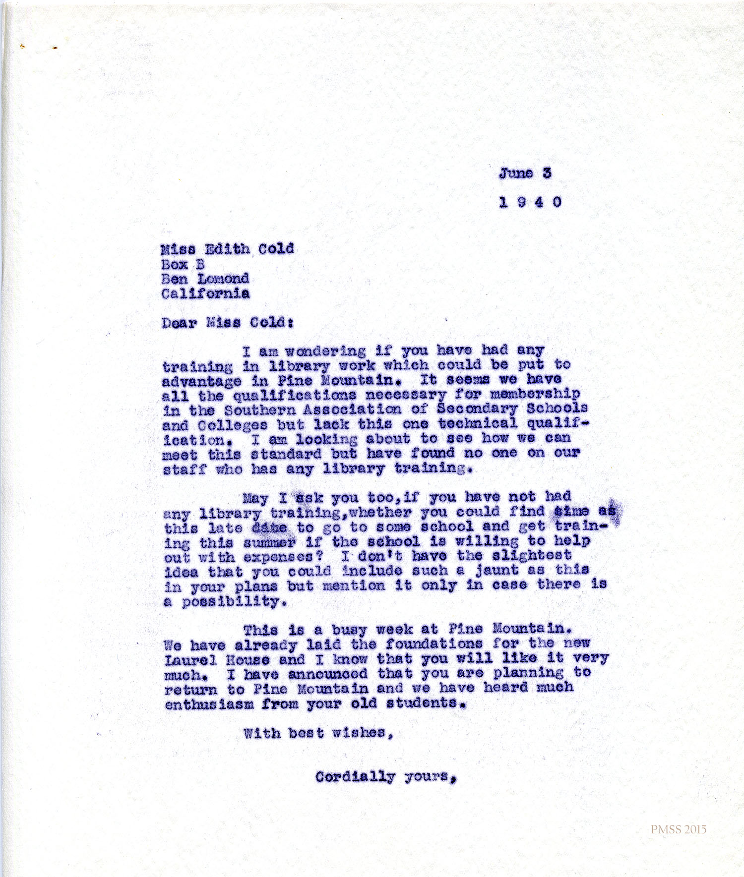 I am wondering if you have had any training in library work which could be put to advantage in Pine Mountain. It seems we have all the qualifications necessary for membership in the Southern Association of Secondary Schools and Colleges but lack this one technical qualification. I am looking about to see how we can meet this standard but have found no one on our staff who has any library training.