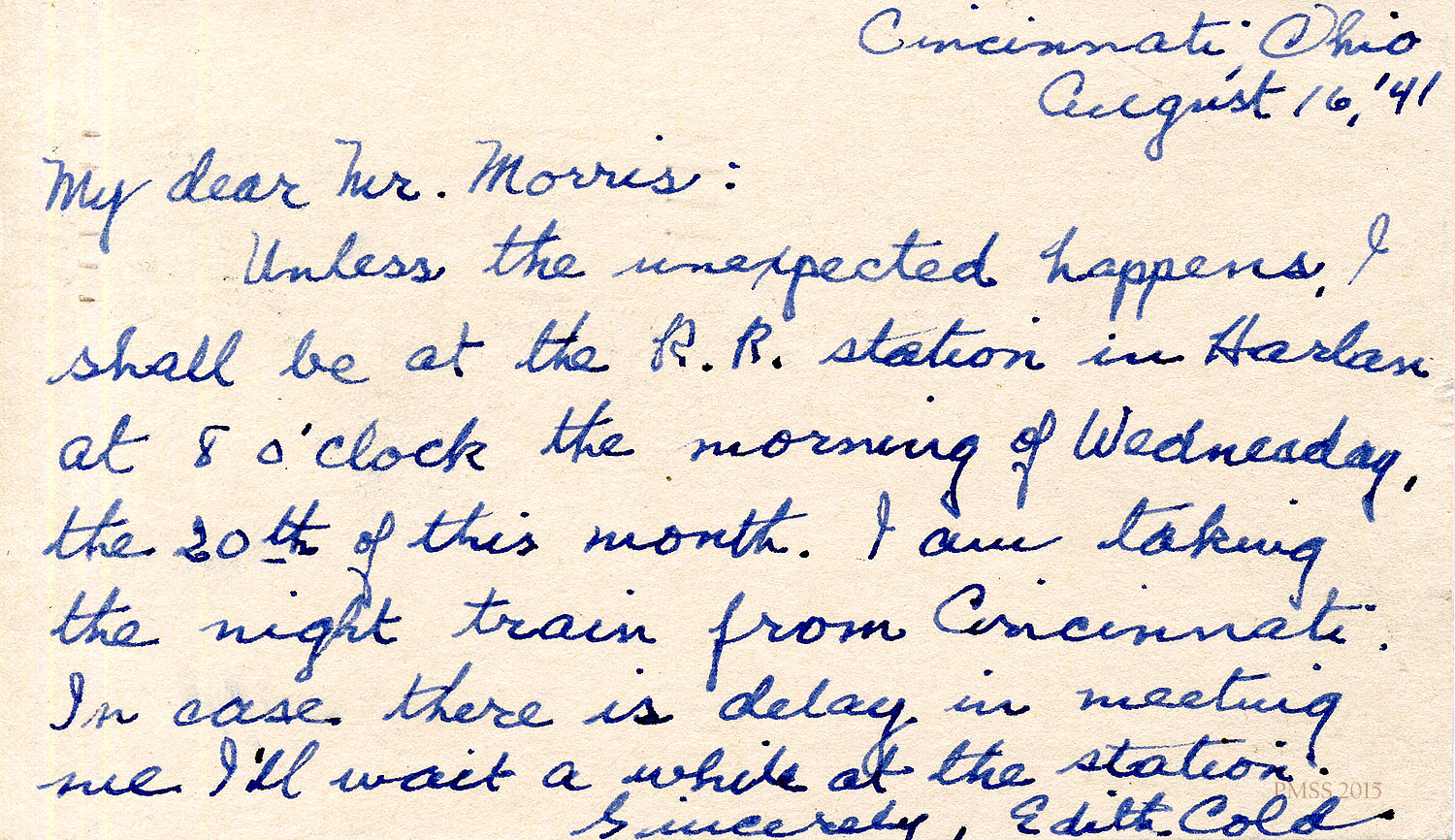 Unless the unexpected happens, I shall be at the R.R. station in Harlan at 8 o’clock the morning of Wednesday, the 20th of this month. I am taking the night train from Cincinnati. In case there is delay in meeting me I’ll wait a while at the station.