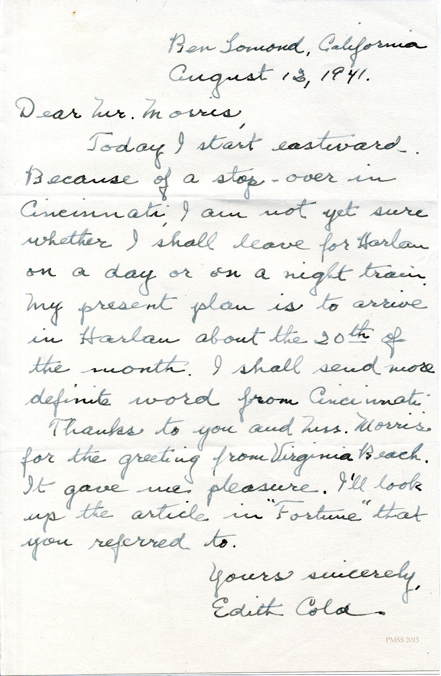 Today I start eastward. Because of a stop-over in Cincinnati, I am not yet sure whether I shall leave for Harlan on a day or on a night train. My present plan is to arrive in Harlan about the 20th of the month. I shall send more definite word from Cincinnati.