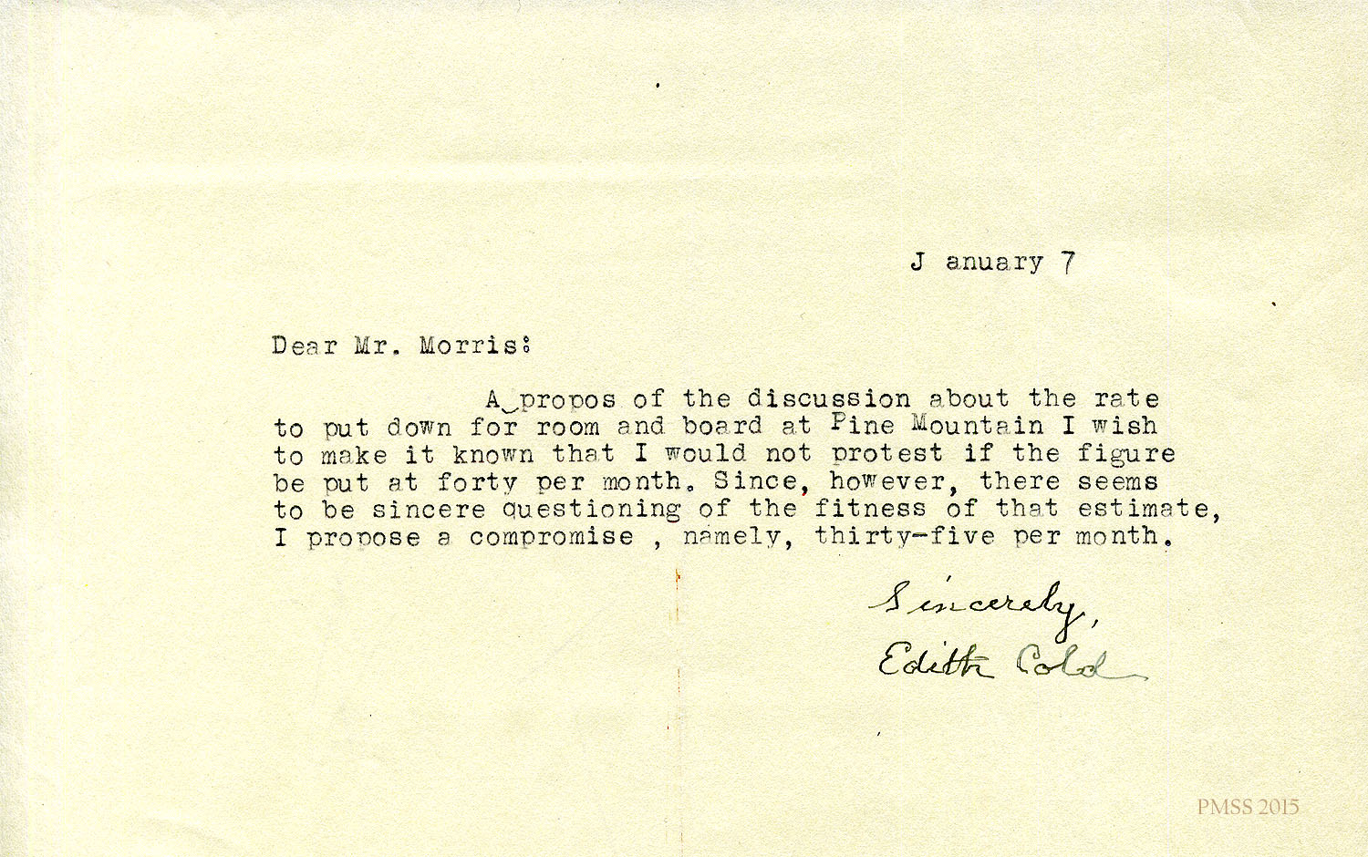 Apropos of the discussion about the rate to put down for room and board at Pine Mountain I wish to make it known that I would not protest if the figure be put at forty per month. Since, however, there seems to be sincere questioning of the fitness of that estimate, I propose a compromise, namely, thirty-five per month.