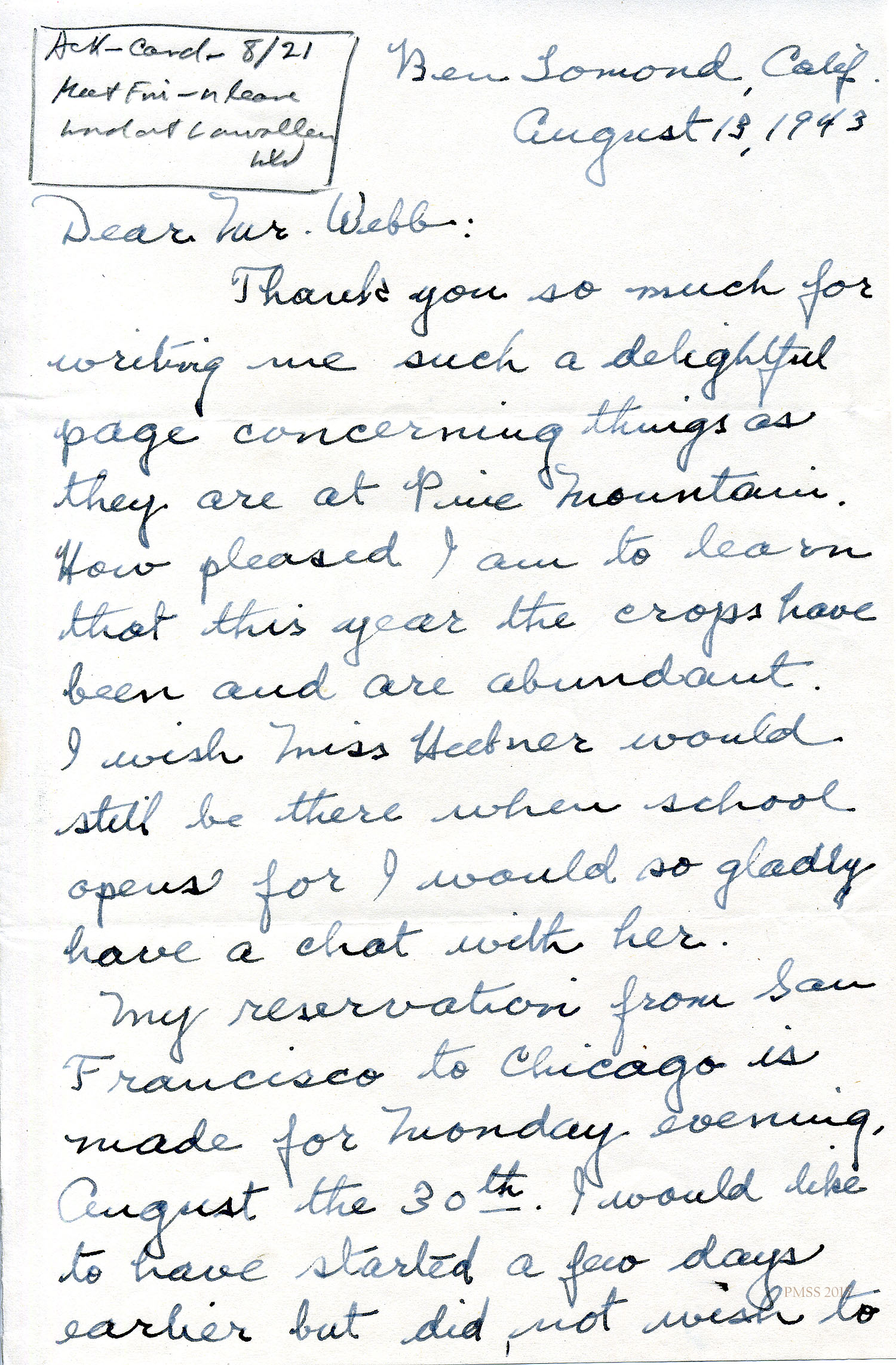 The last day of this month prompts me to write you of the plan for return to Pine Mountain. Doubtless you know that a reservation for a berth can now be made but five days in advance of departure. I hope to get off by the 23rd or the 24th of August. In case I fail of getting a sleeper reservation, I plan to stop off twice so as to get a night’s sleep. The hotels have been written to. I have in mind your request that workers be back about a week in advance of September 2. Should I not be able to affect that, you will understand that there were difficulties on the way.
