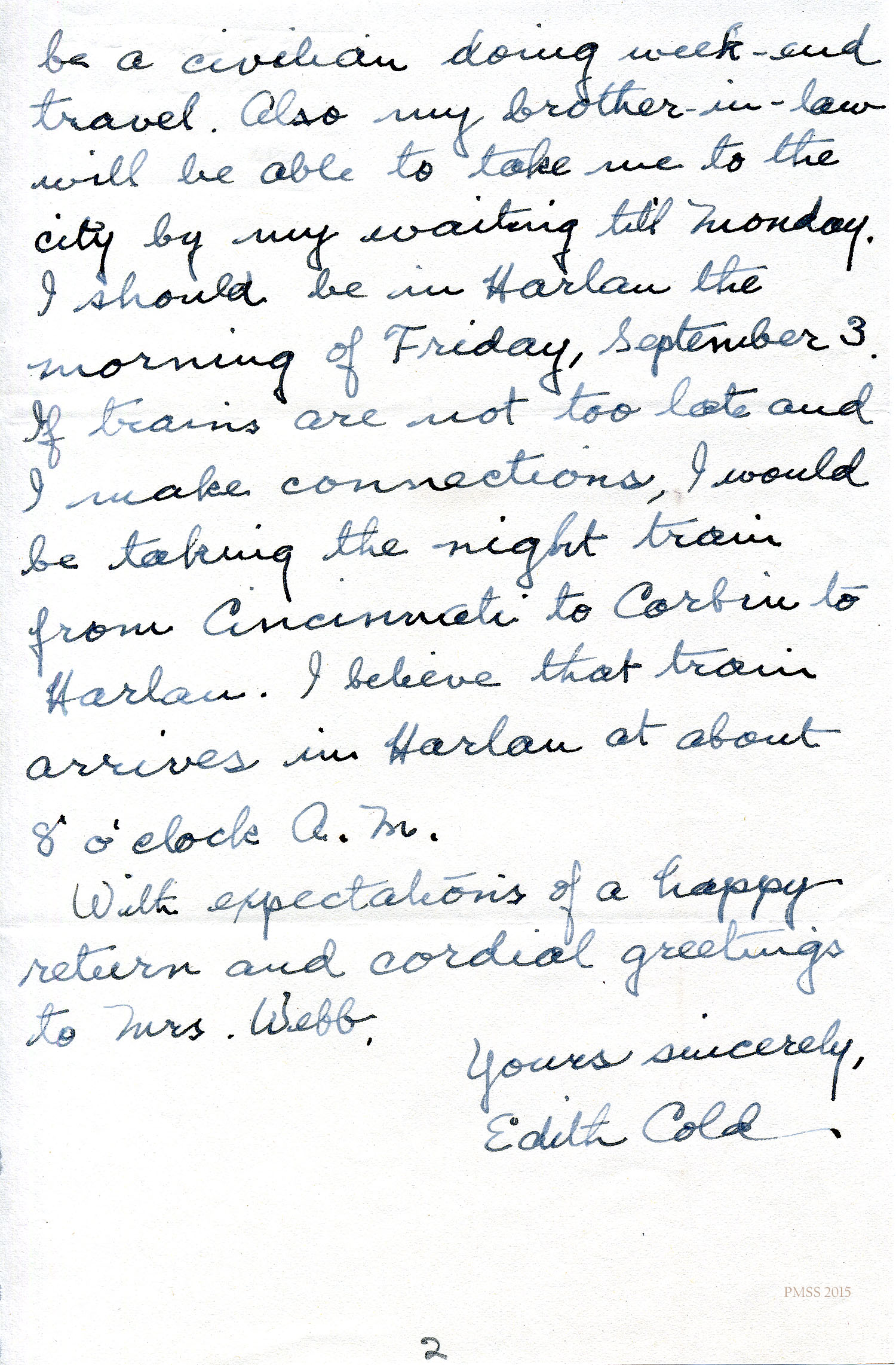 …be a civilian doing week-end travel. Also my brother-in-law will be able to take me to the city by my waiting till Monday. I should be in Harlan the morning of Friday, September 3. If trains are not too late and I make connections, I would be taking the night train from Cincinnati to Corbin to Harlan. I believe that train arrives in Harlan at about 8 o’clock A.M.