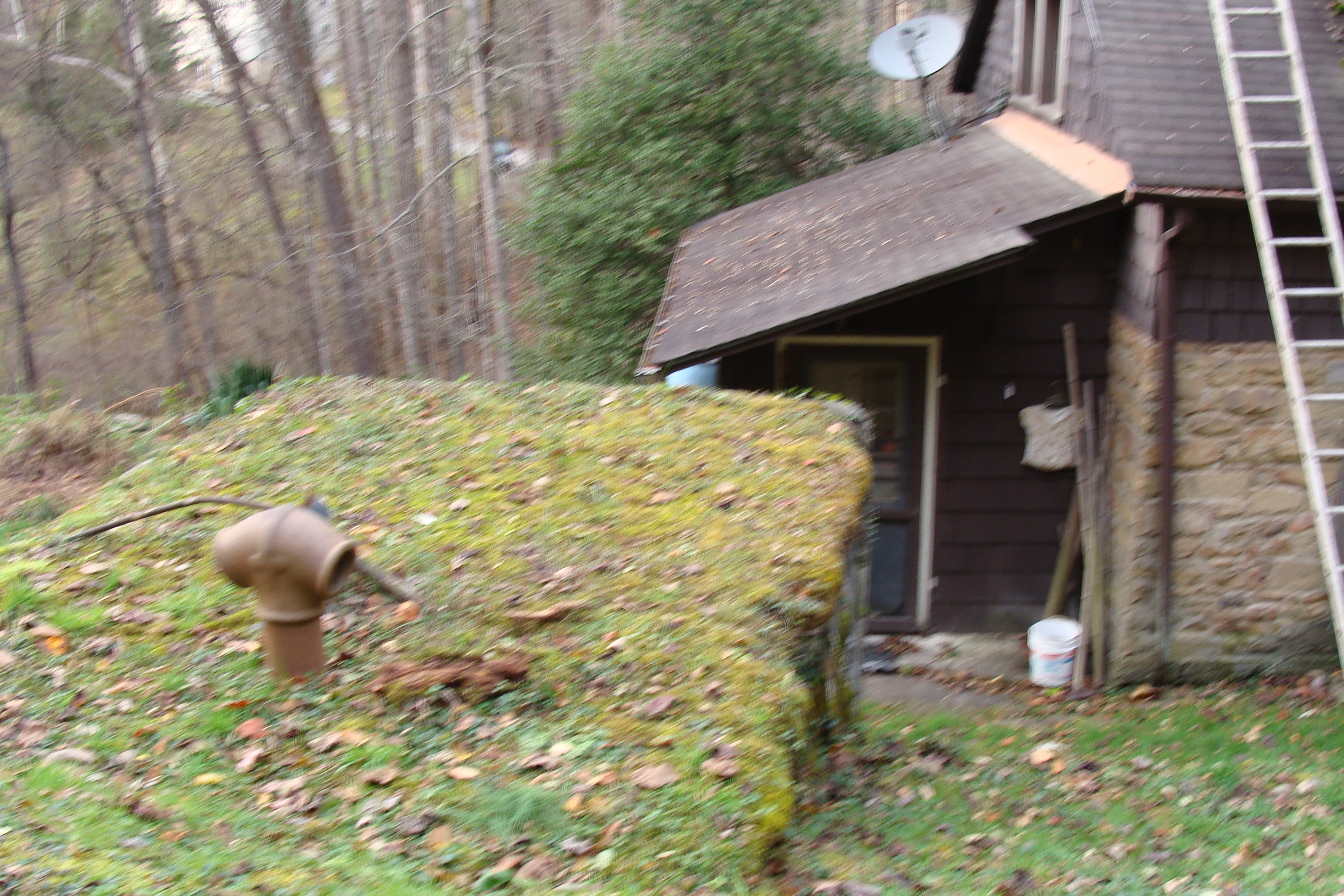 - Zande House, Nov. 2014. Rear of building with roof of cellar and vent pipe. Photo courtesy of Elanor Brawner.