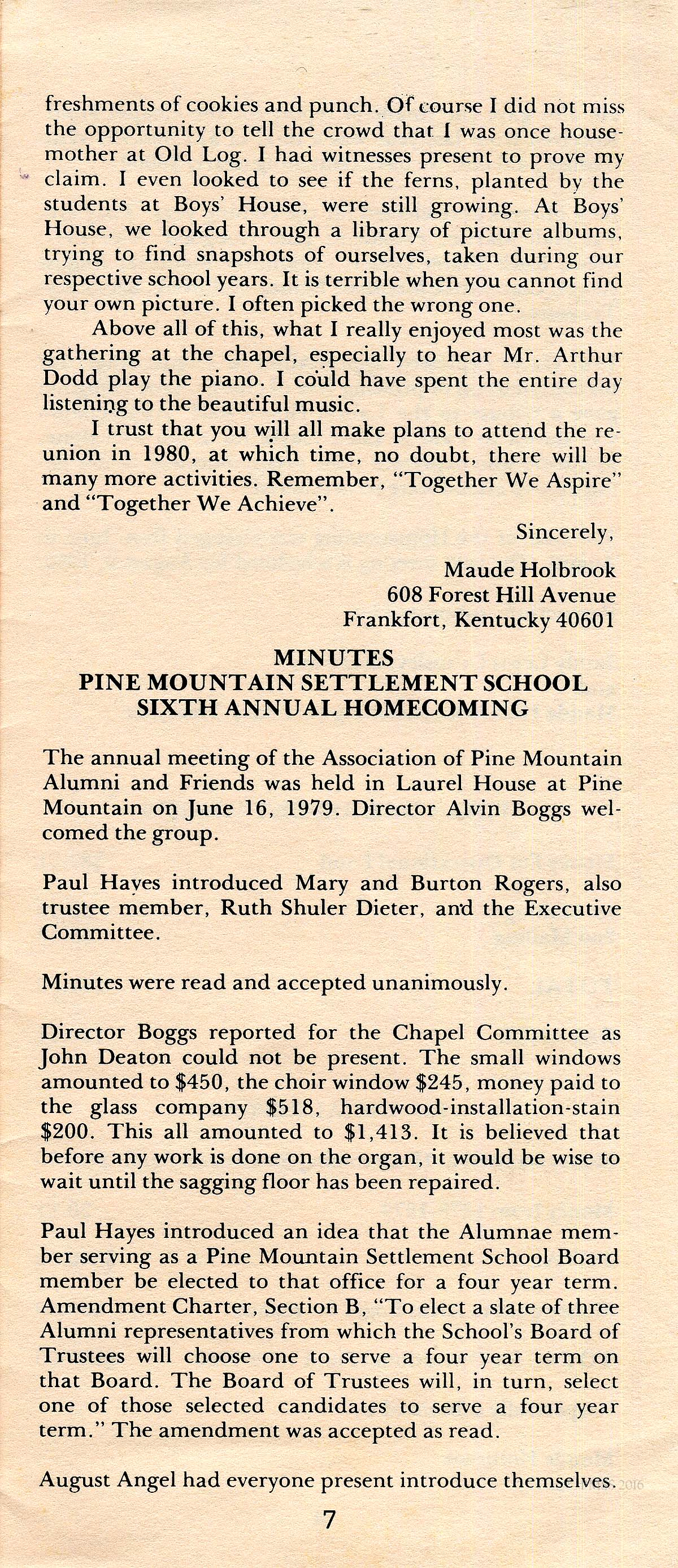 The annual meeting of the Association of Pine Mountain alumni and Friends was held in Laurel House at Pine Mountain on June 16, 1979. Director Alvin Boggs welcomed the group.