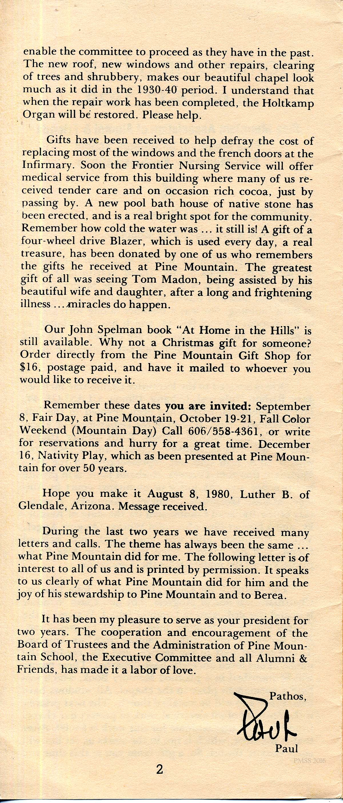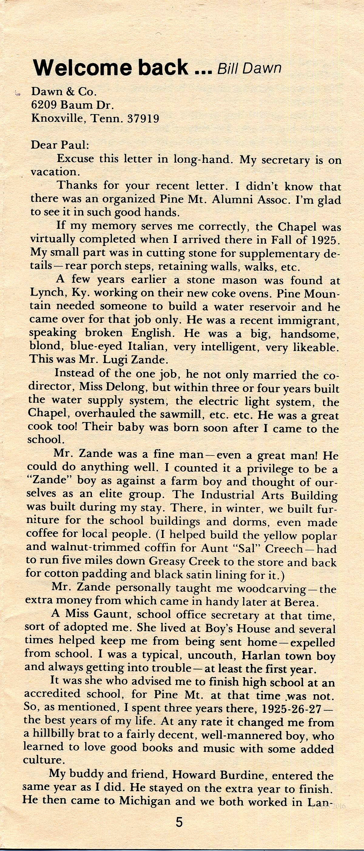 Thanks for your recent letter. I didn’t know that there was an organized Pine Mt. Alumni Assoc. I’m glad to see it in such good hands.