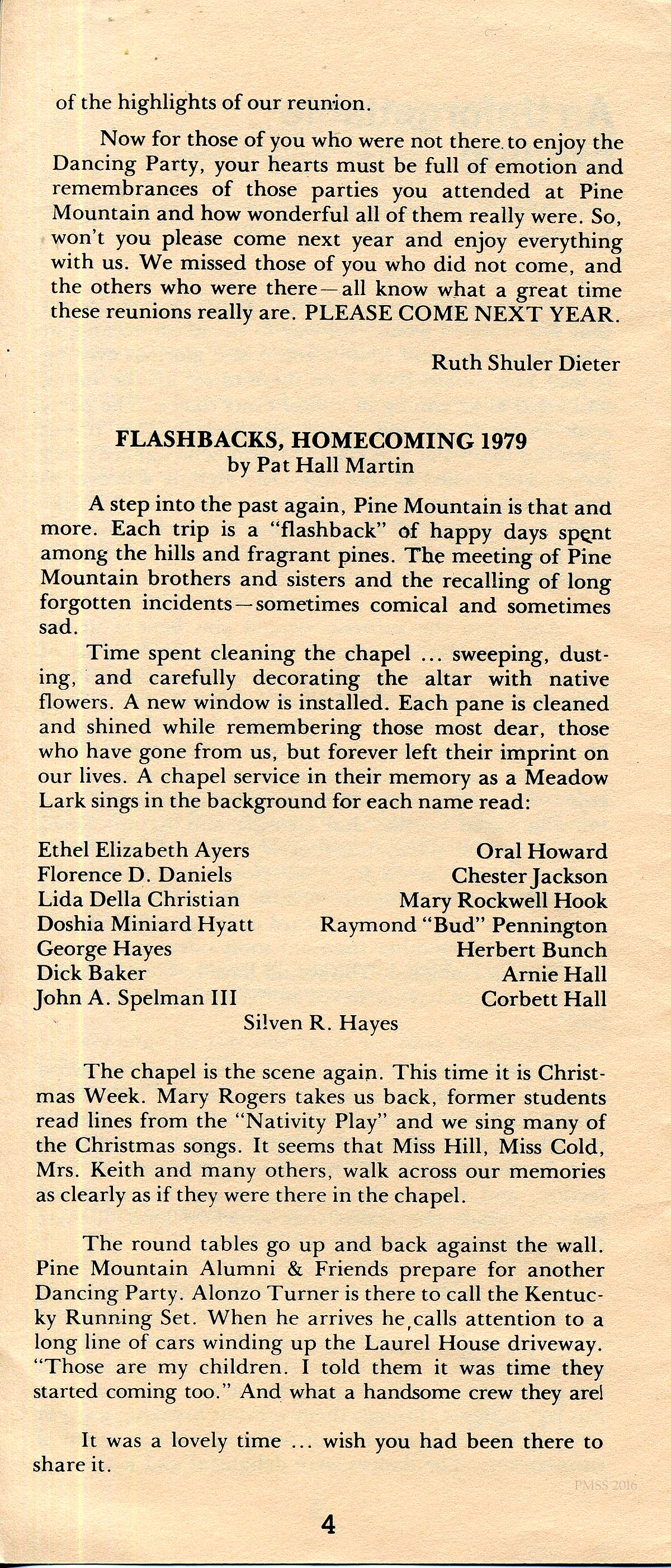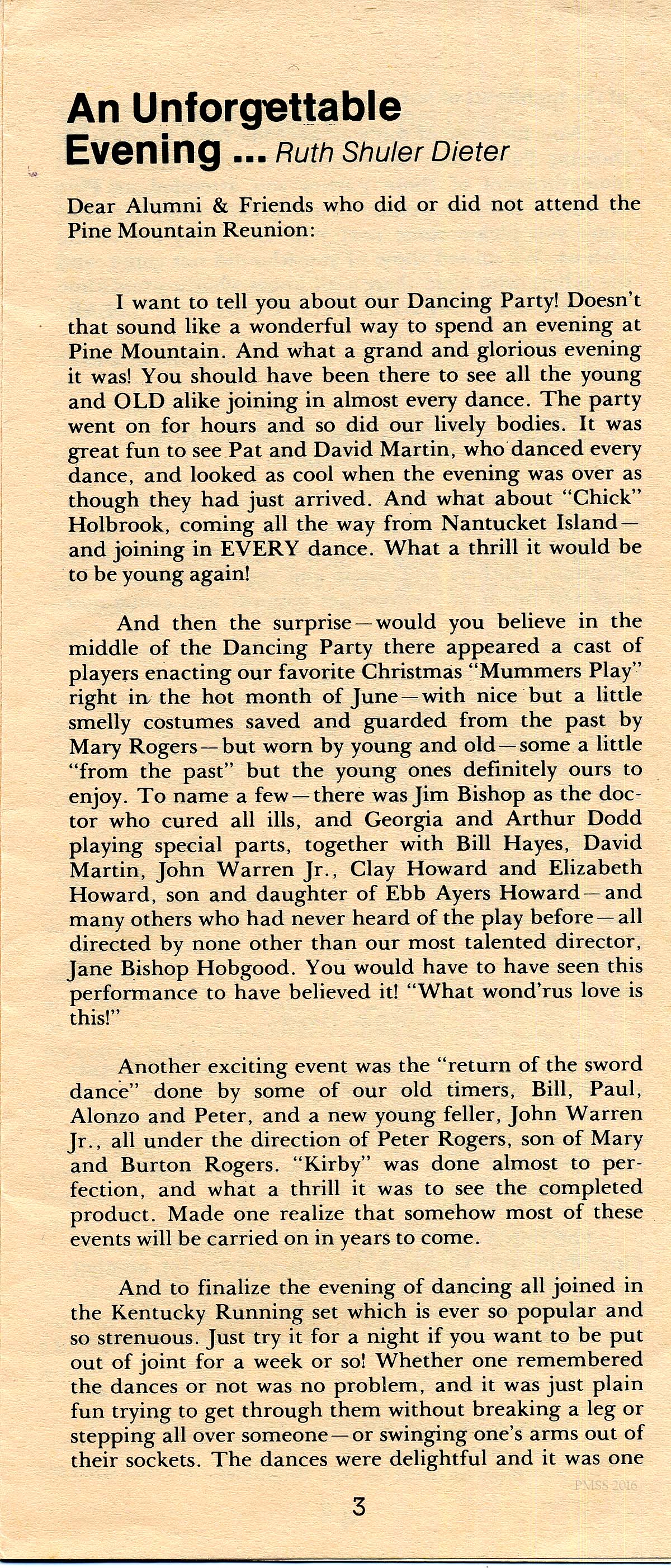 Now for those of you who were not there to enjoy the Dancing Party, your hearts must be full of emotion and remembrances of those parties you attended at Pine Mountain and how wonderful all of them really were. So, won’t you please come next year and enjoy everything with us. We missed those of you who did not come, and the others who were there — all know what a great time these reunions really are. PLEASE COME NEXT YEAR.