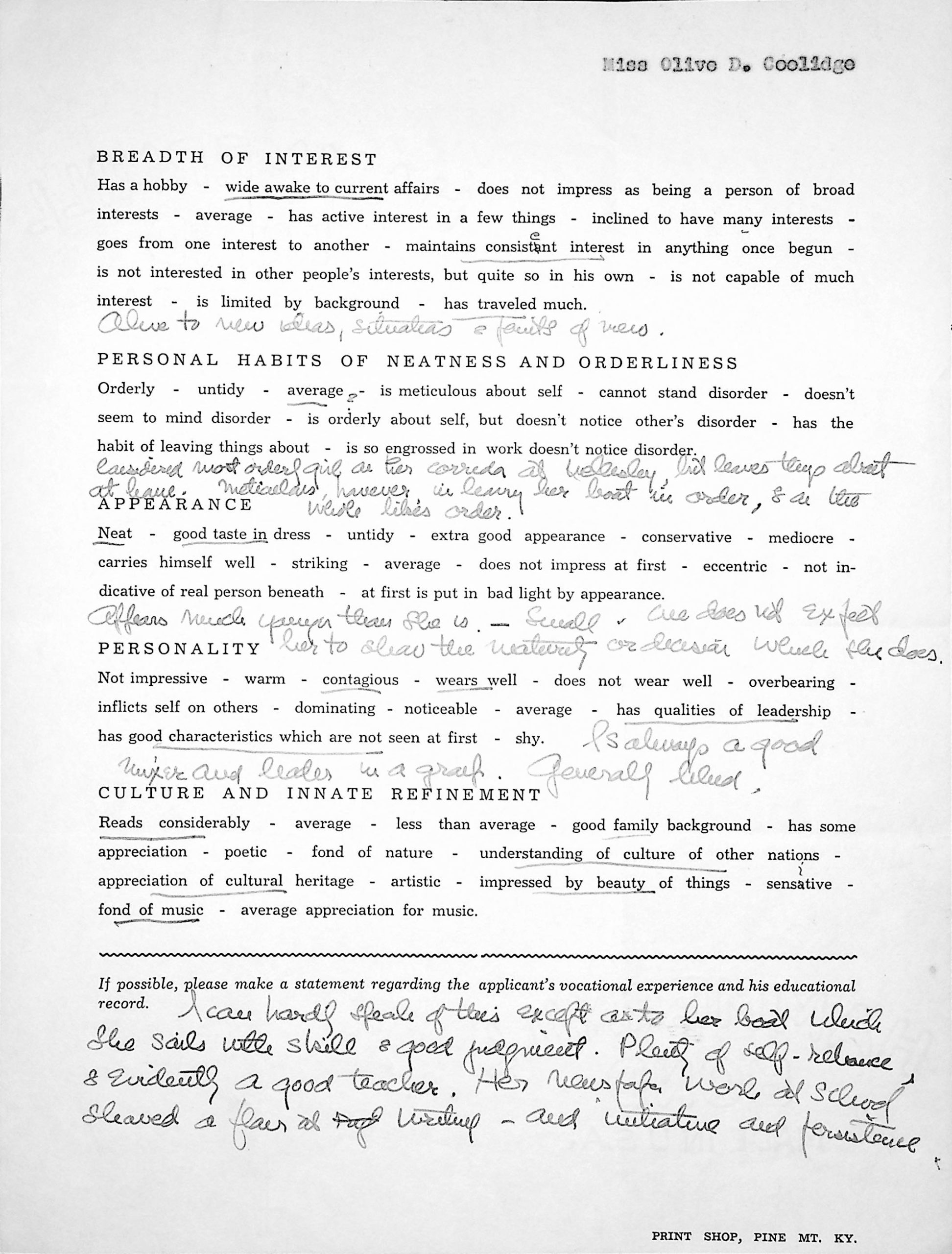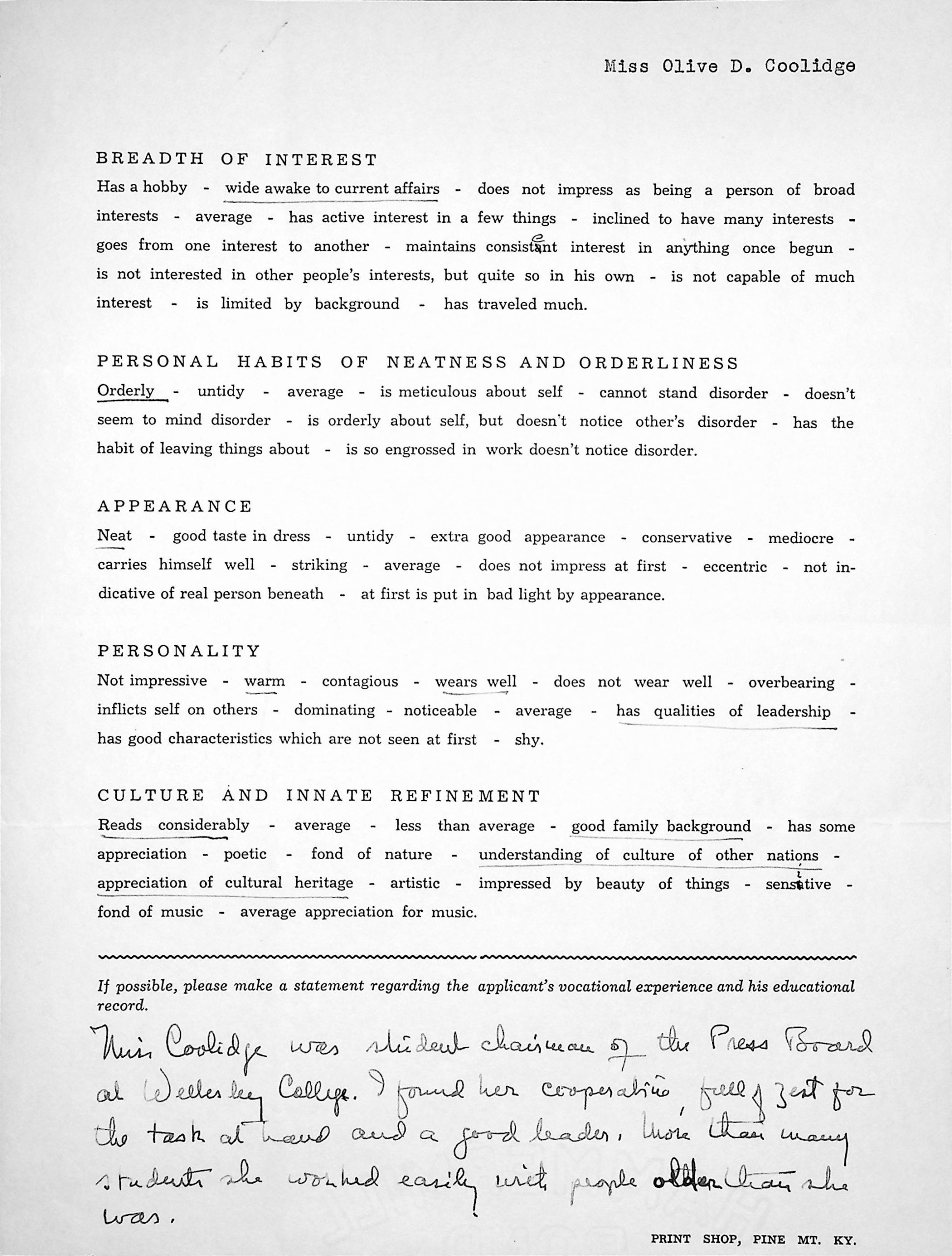 Much of the correspondence listed below is related to Olive Coolidge’s application to be hired as a nurse’s assistant in the hospital at the Pine Mountain Settlement School. See the biography for OLIVE COOLIDGE for more information.
